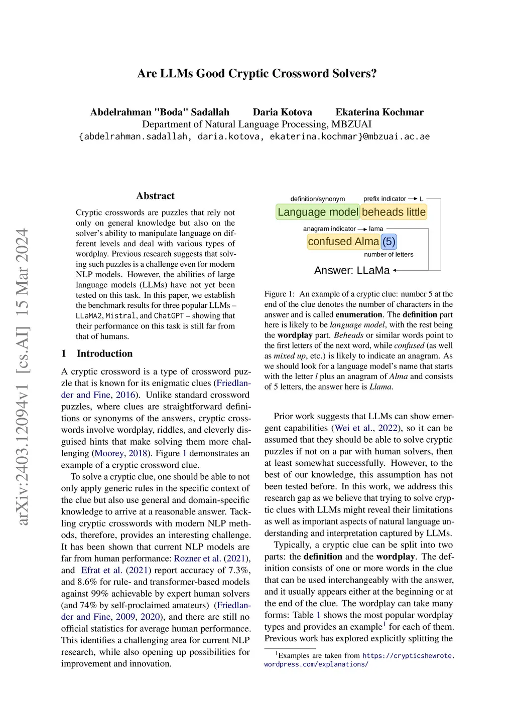 Cryptic crosswords are puzzles that rely not only on general knowledge but also on the solver's ability to manipulate language on different levels and deal with various types of wordplay. Previous research suggests that solving such puzzles is a challenge even for modern NLP models. However, the abilities of large language models (LLMs) have not yet been tested on this task. In this paper, we establish the benchmark results for three popular LLMs -- LLaMA2, Mistral, and ChatGPT -- showing that their performance on this task is still far from that of humans.