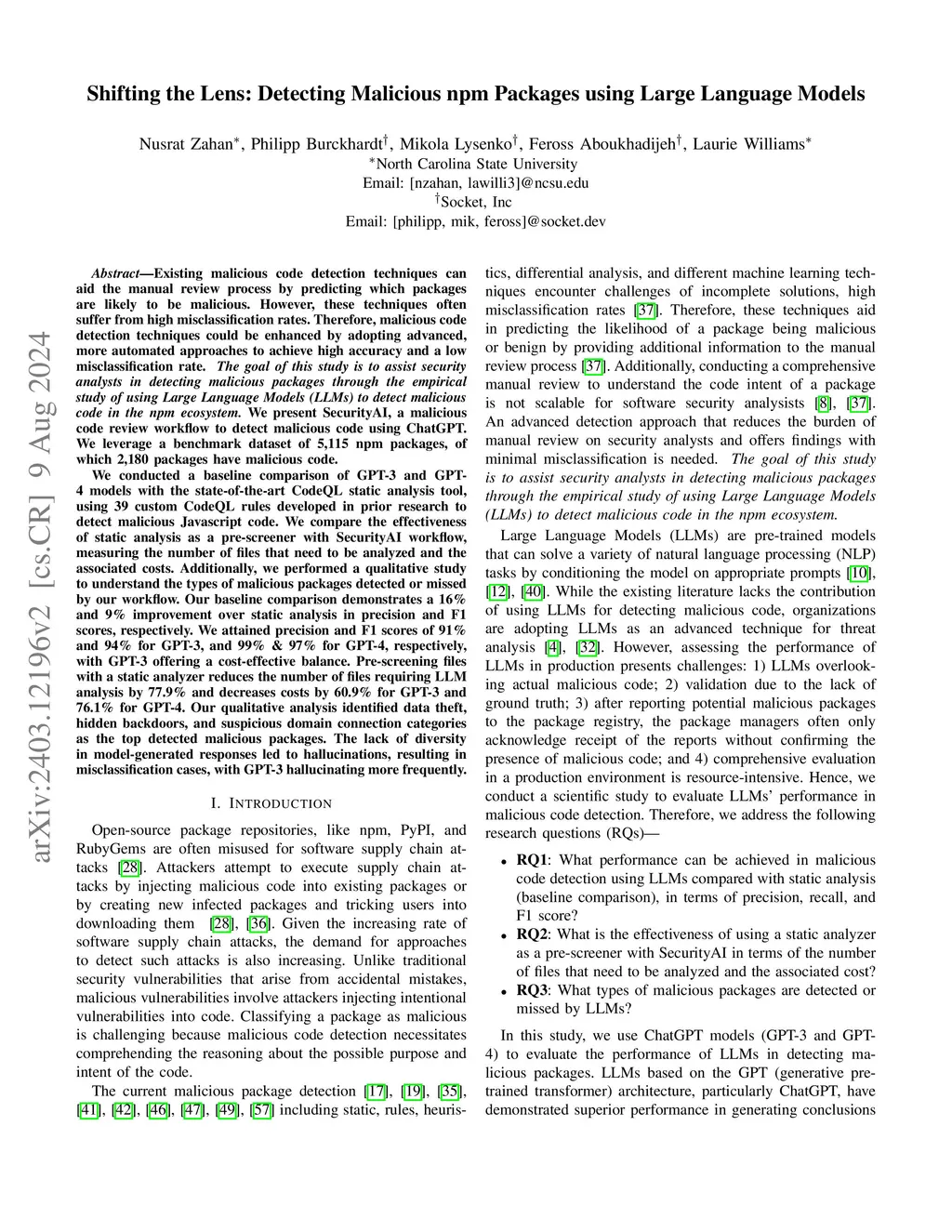 Existing malicious code detection techniques demand the integration of multiple tools to detect different malware patterns, often suffering from high misclassification rates. Therefore, malicious code detection techniques could be enhanced by adopting advanced, more automated approaches to achieve high accuracy and a low misclassification rate. The goal of this study is to aid security analysts in detecting malicious packages by empirically studying the effectiveness of Large Language Models (LLMs) in detecting malicious code. We present SocketAI, a malicious code review workflow to detect malicious code. To evaluate the effectiveness of SocketAI, we leverage a benchmark dataset of 5,115 npm packages, of which 2,180 packages have malicious code. We conducted a baseline comparison of GPT-3 and GPT-4 models with the state-of-the-art CodeQL static analysis tool, using 39 custom CodeQL rules developed in prior research to detect malicious Javascript code. We also compare the effectiveness of static analysis as a pre-screener with SocketAI workflow, measuring the number of files that need to be analyzed. and the associated costs. Additionally, we performed a qualitative study to understand the types of malicious activities detected or missed by our workflow. Our baseline comparison demonstrates a 16% and 9% improvement over static analysis in precision and F1 scores, respectively. GPT-4 achieves higher accuracy with 99% precision and 97% F1 scores, while GPT-3 offers a more cost-effective balance at 91% precision and 94% F1 scores. Pre-screening files with a static analyzer reduces the number of files requiring LLM analysis by 77.9% and decreases costs by 60.9% for GPT-3 and 76.1% for GPT-4. Our qualitative analysis identified data theft, execution of arbitrary code, and suspicious domain categories as the top detected malicious packages.