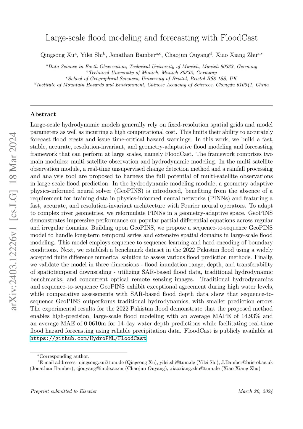 Large-scale hydrodynamic models generally rely on fixed-resolution spatial grids and model parameters as well as incurring a high computational cost. This limits their ability to accurately forecast flood crests and issue time-critical hazard warnings. In this work, we build a fast, stable, accurate, resolution-invariant, and geometry-adaptative flood modeling and forecasting framework that can perform at large scales, namely FloodCast. The framework comprises two main modules: multi-satellite observation and hydrodynamic modeling. In the multi-satellite observation module, a real-time unsupervised change detection method and a rainfall processing and analysis tool are proposed to harness the full potential of multi-satellite observations in large-scale flood prediction. In the hydrodynamic modeling module, a geometry-adaptive physics-informed neural solver (GeoPINS) is introduced, benefiting from the absence of a requirement for training data in physics-informed neural networks and featuring a fast, accurate, and resolution-invariant architecture with Fourier neural operators. GeoPINS demonstrates impressive performance on popular PDEs across regular and irregular domains. Building upon GeoPINS, we propose a sequence-to-sequence GeoPINS model to handle long-term temporal series and extensive spatial domains in large-scale flood modeling. Next, we establish a benchmark dataset in the 2022 Pakistan flood to assess various flood prediction methods. Finally, we validate the model in three dimensions - flood inundation range, depth, and transferability of spatiotemporal downscaling. Traditional hydrodynamics and sequence-to-sequence GeoPINS exhibit exceptional agreement during high water levels, while comparative assessments with SAR-based flood depth data show that sequence-to-sequence GeoPINS outperforms traditional hydrodynamics, with smaller prediction errors.