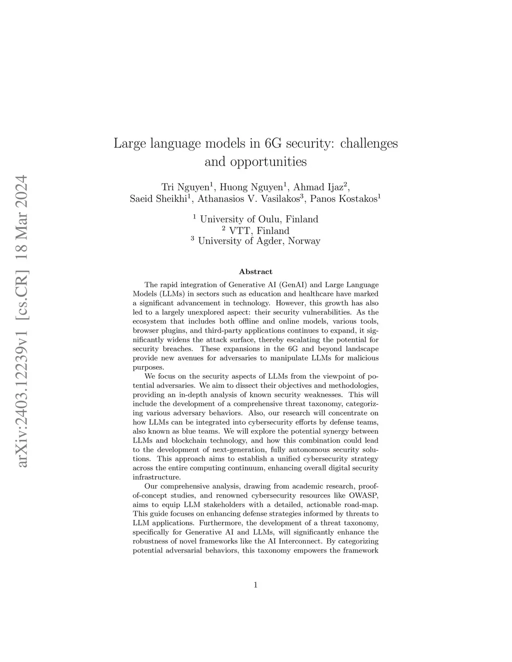 The rapid integration of Generative AI (GenAI) and Large Language Models (LLMs) in sectors such as education and healthcare have marked a significant advancement in technology. However, this growth has also led to a largely unexplored aspect: their security vulnerabilities. As the ecosystem that includes both offline and online models, various tools, browser plugins, and third-party applications continues to expand, it significantly widens the attack surface, thereby escalating the potential for security breaches. These expansions in the 6G and beyond landscape provide new avenues for adversaries to manipulate LLMs for malicious purposes. We focus on the security aspects of LLMs from the viewpoint of potential adversaries. We aim to dissect their objectives and methodologies, providing an in-depth analysis of known security weaknesses. This will include the development of a comprehensive threat taxonomy, categorizing various adversary behaviors. Also, our research will concentrate on how LLMs can be integrated into cybersecurity efforts by defense teams, also known as blue teams. We will explore the potential synergy between LLMs and blockchain technology, and how this combination could lead to the development of next-generation, fully autonomous security solutions. This approach aims to establish a unified cybersecurity strategy across the entire computing continuum, enhancing overall digital security infrastructure.