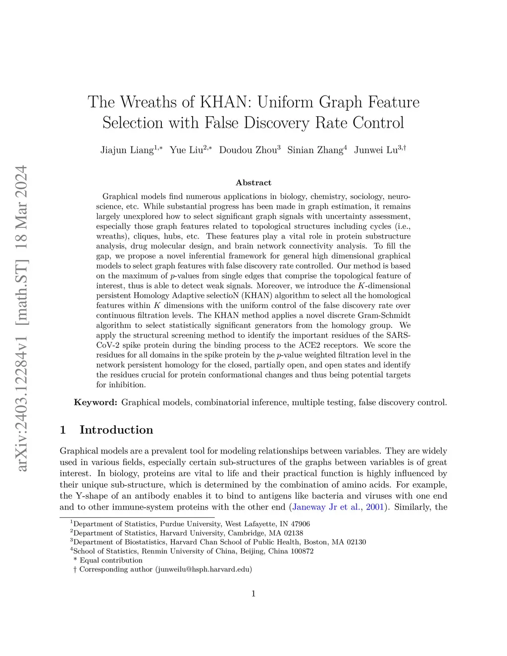 Graphical models find numerous applications in biology, chemistry, sociology, neuroscience, etc. While substantial progress has been made in graph estimation, it remains largely unexplored how to select significant graph signals with uncertainty assessment, especially those graph features related to topological structures including cycles (i.e., wreaths), cliques, hubs, etc. These features play a vital role in protein substructure analysis, drug molecular design, and brain network connectivity analysis. To fill the gap, we propose a novel inferential framework for general high dimensional graphical models to select graph features with false discovery rate controlled. Our method is based on the maximum of -values from single edges that comprise the topological feature of interest, thus is able to detect weak signals. Moreover, we introduce the -dimensional persistent Homology Adaptive selectioN (KHAN) algorithm to select all the homological features within dimensions with the uniform control of the false discovery rate over continuous filtration levels. The KHAN method applies a novel discrete Gram-Schmidt algorithm to select statistically significant generators from the homology group. We apply the structural screening method to identify the important residues of the SARS-CoV-2 spike protein during the binding process to the ACE2 receptors. We score the residues for all domains in the spike protein by the -value weighted filtration level in the network persistent homology for the closed, partially open, and open states and identify the residues crucial for protein conformational changes and thus being potential targets for inhibition.