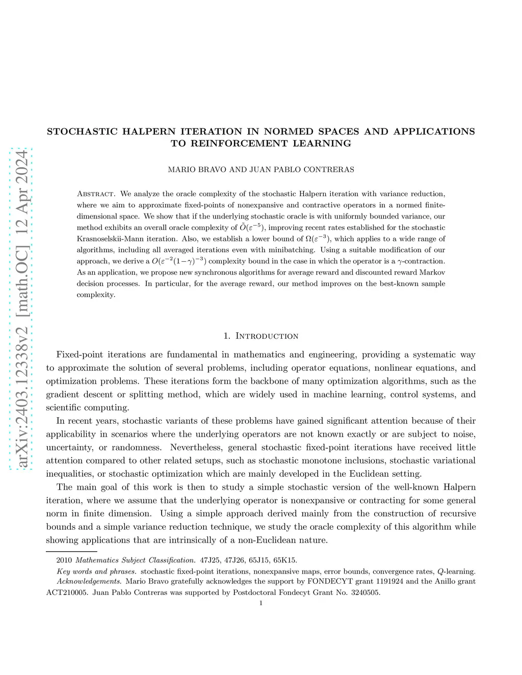 We analyze the oracle complexity of the stochastic Halpern iteration with minibatch, where we aim to approximate fixed-points of nonexpansive and contractive operators in a normed finite-dimensional space. We show that if the underlying stochastic oracle has uniformly bounded variance, our method exhibits an overall oracle complexity of , to obtain expected fixed-point residual for nonexpansive operators, improving recent rates established for the stochastic Krasnoselskii-Mann iteration. Also, we establish a lower bound of which applies to a wide range of algorithms, including all averaged iterations even with minibatching. Using a suitable modification of our approach, we derive a complexity bound in the case in which the operator is a -contraction to obtain an approximation of the fixed-point. As an application, we propose new model-free algorithms for average and discounted reward MDPs. For the average reward case, our method applies to weakly communicating MDPs without requiring prior parameter knowledge.