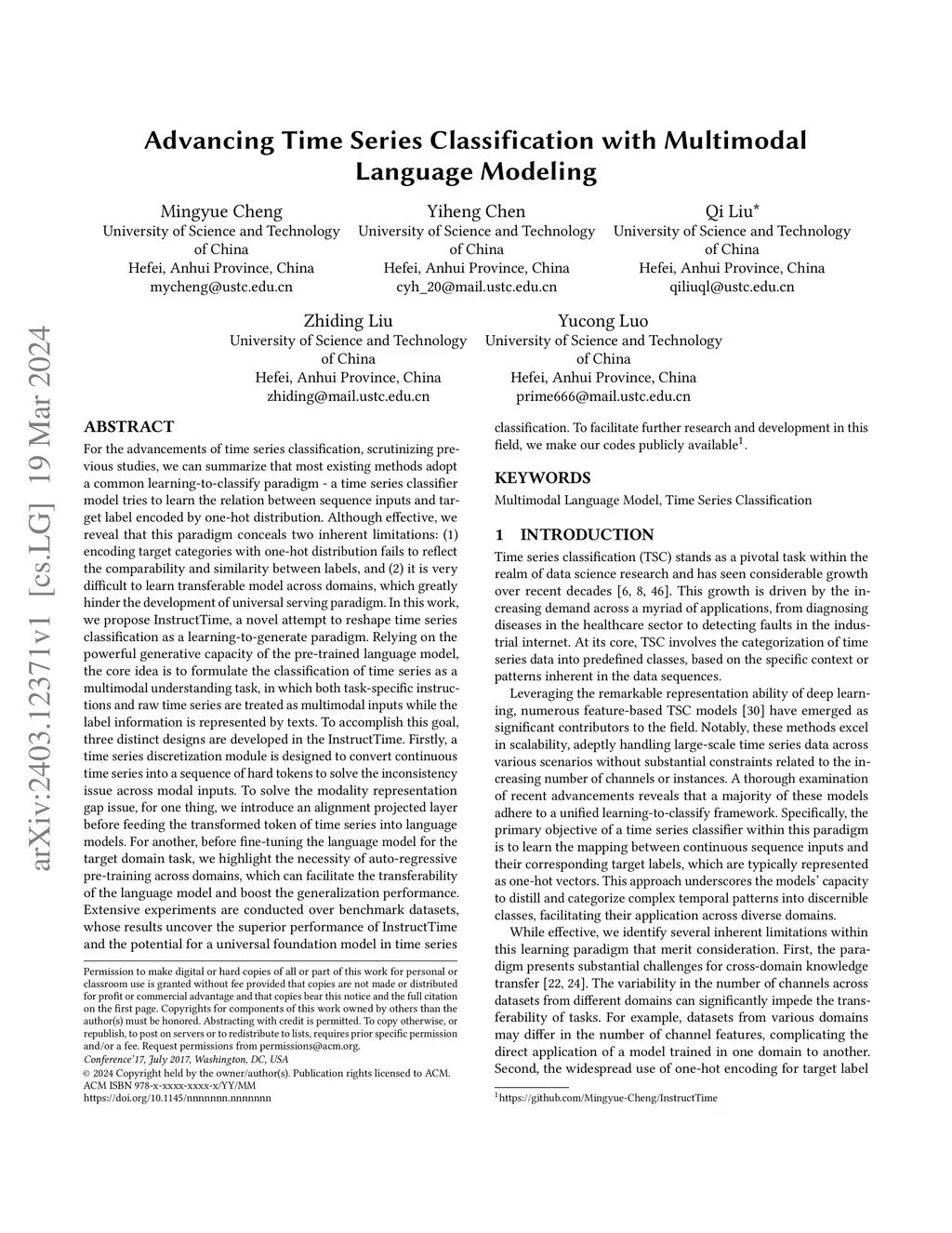 For the advancements of time series classification, scrutinizing previous studies, most existing methods adopt a common learning-to-classify paradigm - a time series classifier model tries to learn the relation between sequence inputs and target label encoded by one-hot distribution. Although effective, this paradigm conceals two inherent limitations: (1) encoding target categories with one-hot distribution fails to reflect the comparability and similarity between labels, and (2) it is very difficult to learn transferable model across domains, which greatly hinder the development of universal serving paradigm. In this work, we propose InstructTime, a novel attempt to reshape time series classification as a learning-to-generate paradigm. Relying on the powerful generative capacity of the pre-trained language model, the core idea is to formulate the classification of time series as a multimodal understanding task, in which both task-specific instructions and raw time series are treated as multimodal inputs while the label information is represented by texts. To accomplish this goal, three distinct designs are developed in the InstructTime. Firstly, a time series discretization module is designed to convert continuous time series into a sequence of hard tokens to solve the inconsistency issue across modal inputs. To solve the modality representation gap issue, for one thing, we introduce an alignment projected layer before feeding the transformed token of time series into language models. For another, we highlight the necessity of auto-regressive pre-training across domains, which can facilitate the transferability of the language model and boost the generalization performance. Extensive experiments are conducted over benchmark datasets, whose results uncover the superior performance of InstructTime and the potential for a universal foundation model in time series classification.