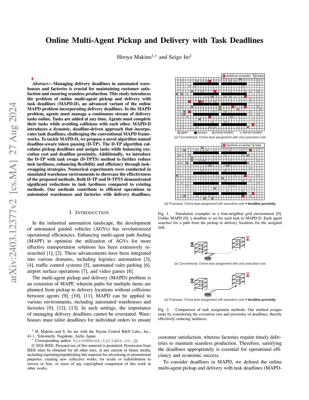 Managing delivery deadlines in automated warehouses and factories is crucial for maintaining customer satisfaction and ensuring seamless production. This study introduces the problem of online multi-agent pickup and delivery with task deadlines (MAPD-D), which is an advanced variant of the online MAPD problem incorporating delivery deadlines. MAPD-D presents a dynamic deadline-driven approach that includes task deadlines, with tasks being added at any time (online), thus challenging conventional MAPD frameworks. To tackle MAPD-D, we propose a novel algorithm named deadline-aware token passing (D-TP). The D-TP algorithm is designed to calculate pickup deadlines and assign tasks while balancing execution cost and deadline proximity. Additionally, we introduce the D-TP with task swaps (D-TPTS) method to further reduce task tardiness, enhancing flexibility and efficiency via task-swapping strategies. Numerical experiments were conducted in simulated warehouse environments to showcase the effectiveness of the proposed methods. Both D-TP and D-TPTS demonstrate significant reductions in task tardiness compared to existing methods, thereby contributing to efficient operations in automated warehouses and factories with delivery deadlines.