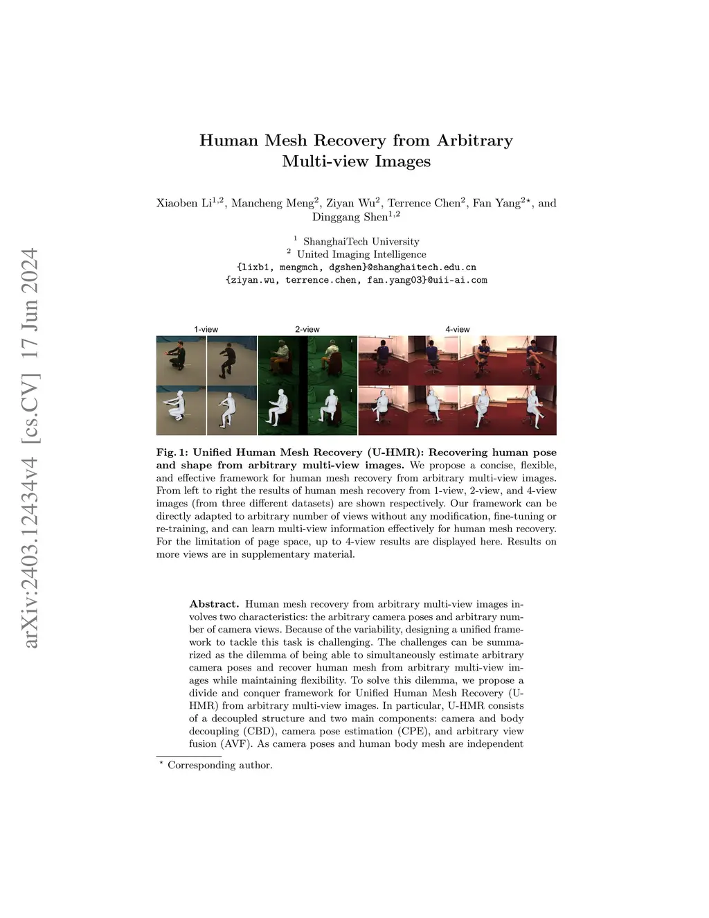 Human mesh recovery from arbitrary multi-view images involves two characteristics: the arbitrary camera poses and arbitrary number of camera views. Because of the variability, designing a unified framework to tackle this task is challenging. The challenges can be summarized as the dilemma of being able to simultaneously estimate arbitrary camera poses and recover human mesh from arbitrary multi-view images while maintaining flexibility. To solve this dilemma, we propose a divide and conquer framework for Unified Human Mesh Recovery (U-HMR) from arbitrary multi-view images. In particular, U-HMR consists of a decoupled structure and two main components: camera and body decoupling (CBD), camera pose estimation (CPE), and arbitrary view fusion (AVF). As camera poses and human body mesh are independent of each other, CBD splits the estimation of them into two sub-tasks for two individual sub-networks (ie, CPE and AVF) to handle respectively, thus the two sub-tasks are disentangled. In CPE, since each camera pose is unrelated to the others, we adopt a shared MLP to process all views in a parallel way. In AVF, in order to fuse multi-view information and make the fusion operation independent of the number of views, we introduce a transformer decoder with a SMPL parameters query token to extract cross-view features for mesh recovery. To demonstrate the efficacy and flexibility of the proposed framework and effect of each component, we conduct extensive experiments on three public datasets: Human3.6M, MPI-INF-3DHP, and TotalCapture.