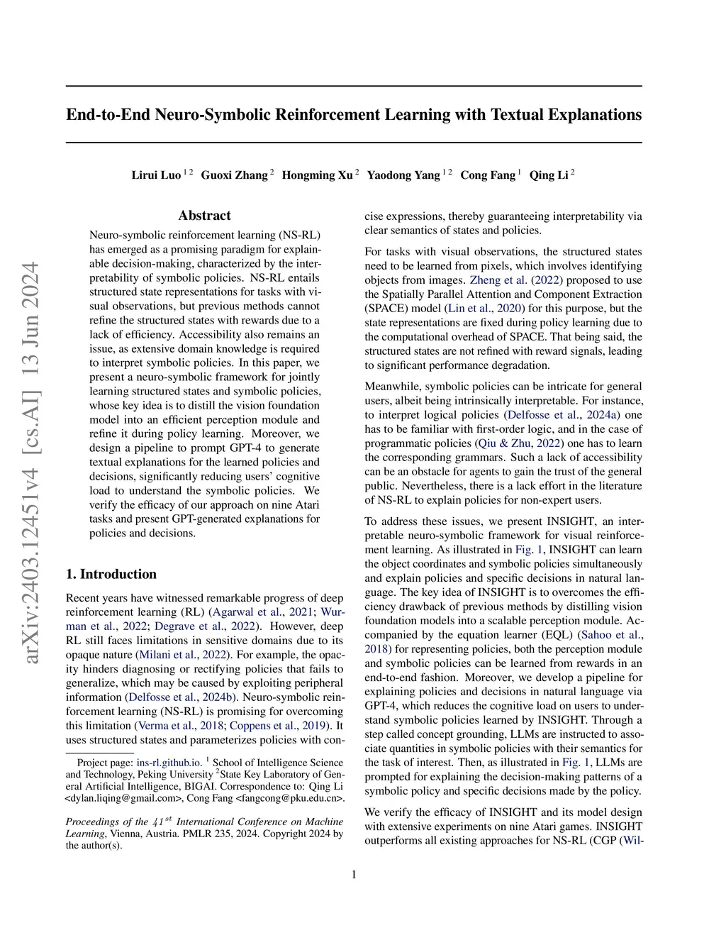 Neuro-symbolic reinforcement learning (NS-RL) has emerged as a promising paradigm for explainable decision-making, characterized by the interpretability of symbolic policies. NS-RL entails structured state representations for tasks with visual observations, but previous methods cannot refine the structured states with rewards due to a lack of efficiency. Accessibility also remains an issue, as extensive domain knowledge is required to interpret symbolic policies. In this paper, we present a neuro-symbolic framework for jointly learning structured states and symbolic policies, whose key idea is to distill the vision foundation model into an efficient perception module and refine it during policy learning. Moreover, we design a pipeline to prompt GPT-4 to generate textual explanations for the learned policies and decisions, significantly reducing users' cognitive load to understand the symbolic policies. We verify the efficacy of our approach on nine Atari tasks and present GPT-generated explanations for policies and decisions.