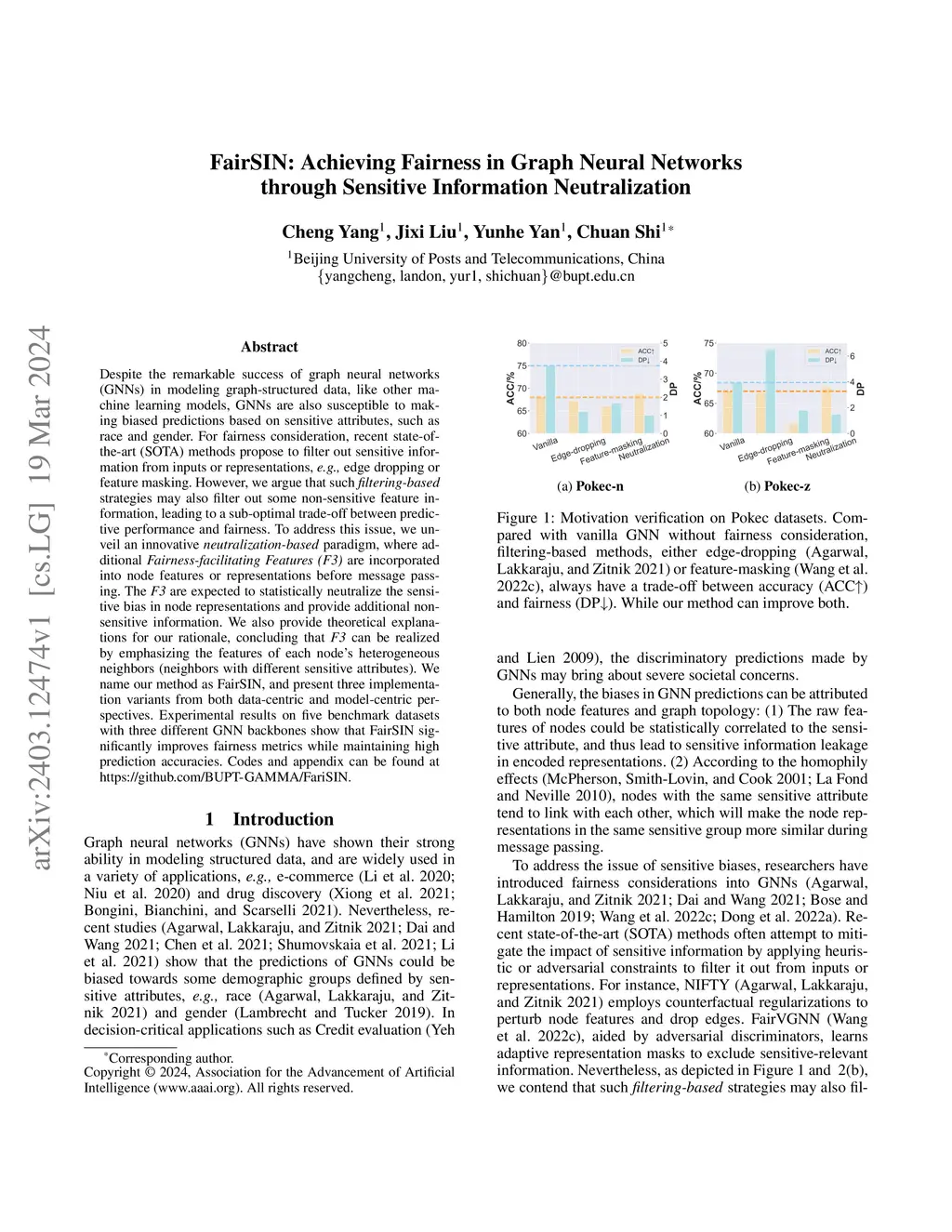 Despite the remarkable success of graph neural networks (GNNs) in modeling graph-structured data, like other machine learning models, GNNs are also susceptible to making biased predictions based on sensitive attributes, such as race and gender. For fairness consideration, recent state-of-the-art (SOTA) methods propose to filter out sensitive information from inputs or representations, e.g., edge dropping or feature masking. However, we argue that such filtering-based strategies may also filter out some non-sensitive feature information, leading to a sub-optimal trade-off between predictive performance and fairness. To address this issue, we unveil an innovative neutralization-based paradigm, where additional Fairness-facilitating Features (F3) are incorporated into node features or representations before message passing. The F3 are expected to statistically neutralize the sensitive bias in node representations and provide additional nonsensitive information. We also provide theoretical explanations for our rationale, concluding that F3 can be realized by emphasizing the features of each node's heterogeneous neighbors (neighbors with different sensitive attributes). We name our method as FairSIN, and present three implementation variants from both data-centric and model-centric perspectives. Experimental results on five benchmark datasets with three different GNN backbones show that FairSIN significantly improves fairness metrics while maintaining high prediction accuracies.