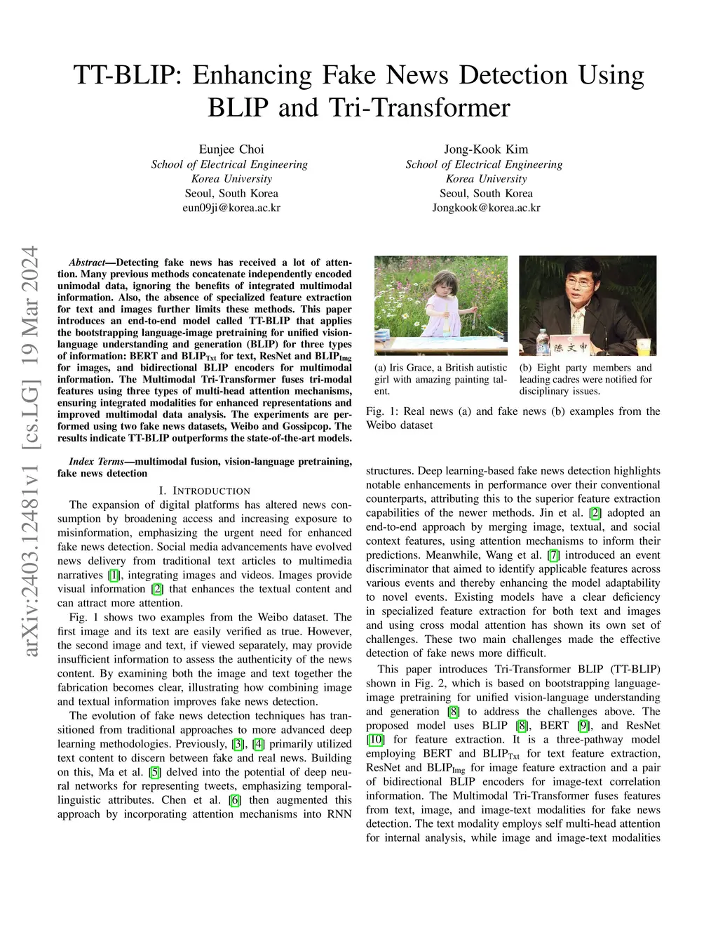 Detecting fake news has received a lot of attention. Many previous methods concatenate independently encoded unimodal data, ignoring the benefits of integrated multimodal information. Also, the absence of specialized feature extraction for text and images further limits these methods. This paper introduces an end-to-end model called TT-BLIP that applies the bootstrapping language-image pretraining for unified vision-language understanding and generation (BLIP) for three types of information: BERT and BLIPTxt for text, ResNet and BLIPImg for images, and bidirectional BLIP encoders for multimodal information. The Multimodal Tri-Transformer fuses tri-modal features using three types of multi-head attention mechanisms, ensuring integrated modalities for enhanced representations and improved multimodal data analysis. The experiments are performed using two fake news datasets, Weibo and Gossipcop. The results indicate TT-BLIP outperforms the state-of-the-art models.