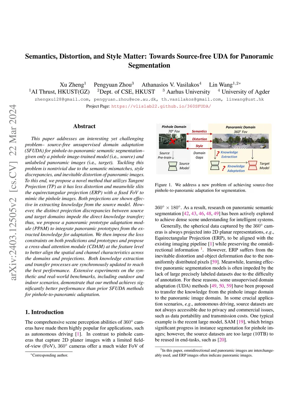 This paper addresses an interesting yet challenging problem -- source-free unsupervised domain adaptation (SFUDA) for pinhole-to-panoramic semantic segmentation -- given only a pinhole image-trained model (i.e., source) and unlabeled panoramic images (i.e., target). Tackling this problem is nontrivial due to the semantic mismatches, style discrepancies, and inevitable distortion of panoramic images. To this end, we propose a novel method that utilizes Tangent Projection (TP) as it has less distortion and meanwhile slits the equirectangular projection (ERP) with a fixed FoV to mimic the pinhole images. Both projections are shown effective in extracting knowledge from the source model. However, the distinct projection discrepancies between source and target domains impede the direct knowledge transfer; thus, we propose a panoramic prototype adaptation module (PPAM) to integrate panoramic prototypes from the extracted knowledge for adaptation. We then impose the loss constraints on both predictions and prototypes and propose a cross-dual attention module (CDAM) at the feature level to better align the spatial and channel characteristics across the domains and projections. Both knowledge extraction and transfer processes are synchronously updated to reach the best performance. Extensive experiments on the synthetic and real-world benchmarks, including outdoor and indoor scenarios, demonstrate that our method achieves significantly better performance than prior SFUDA methods for pinhole-to-panoramic adaptation.
