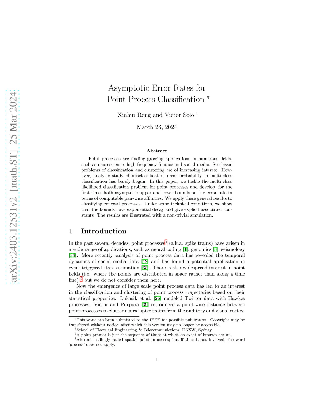 Point processes are finding growing applications in numerous fields, such as neuroscience, high frequency finance and social media. So classic problems of classification and clustering are of increasing interest. However, analytic study of misclassification error probability in multi-class classification has barely begun. In this paper, we tackle the multi-class likelihood classification problem for point processes and develop, for the first time, both asymptotic upper and lower bounds on the error rate in terms of computable pair-wise affinities. We apply these general results to classifying renewal processes. Under some technical conditions, we show that the bounds have exponential decay and give explicit associated constants. The results are illustrated with a non-trivial simulation.