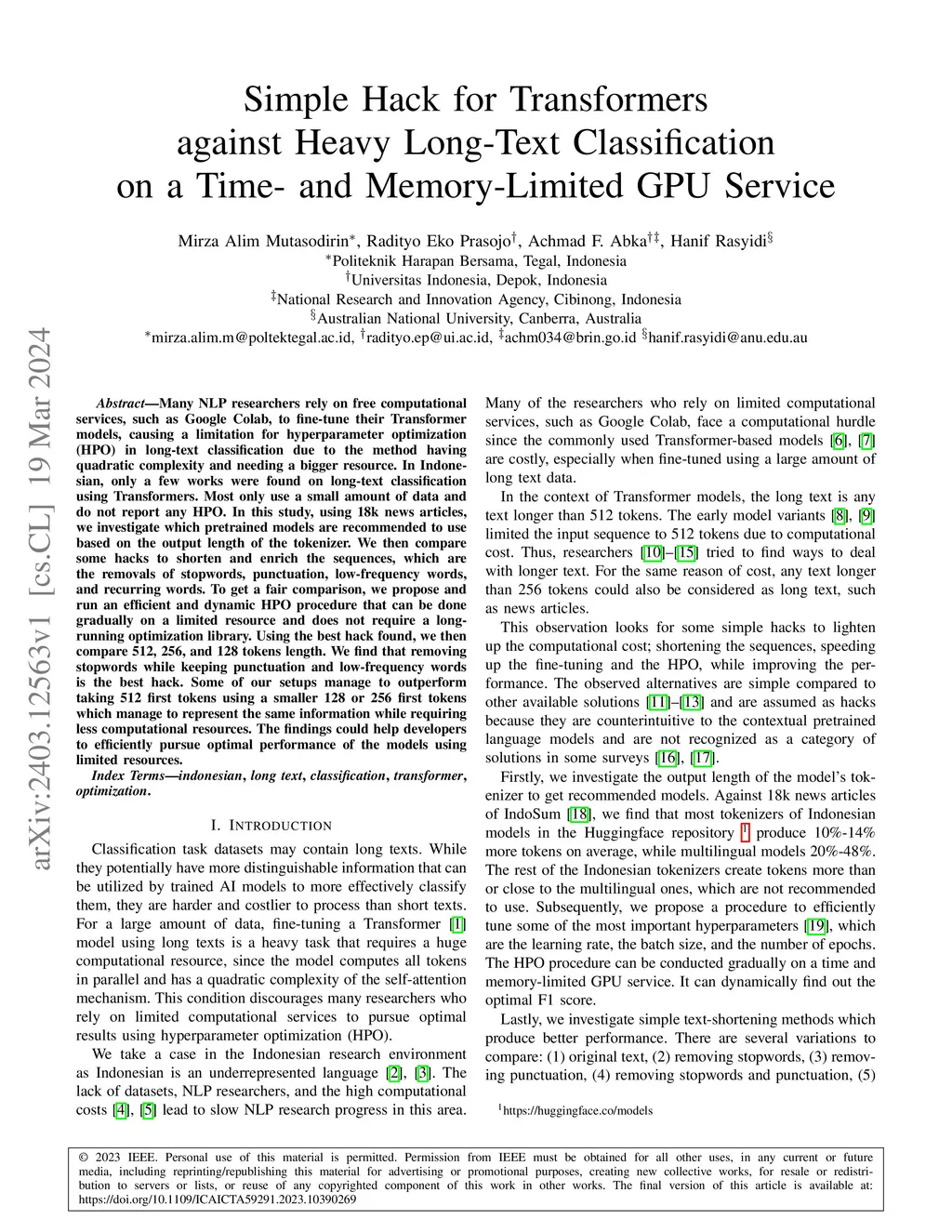 Many NLP researchers rely on free computational services, such as Google Colab, to fine-tune their Transformer models, causing a limitation for hyperparameter optimization (HPO) in long-text classification due to the method having quadratic complexity and needing a bigger resource. In Indonesian, only a few works were found on long-text classification using Transformers. Most only use a small amount of data and do not report any HPO. In this study, using 18k news articles, we investigate which pretrained models are recommended to use based on the output length of the tokenizer. We then compare some hacks to shorten and enrich the sequences, which are the removals of stopwords, punctuation, low-frequency words, and recurring words. To get a fair comparison, we propose and run an efficient and dynamic HPO procedure that can be done gradually on a limited resource and does not require a long-running optimization library. Using the best hack found, we then compare 512, 256, and 128 tokens length. We find that removing stopwords while keeping punctuation and low-frequency words is the best hack. Some of our setups manage to outperform taking 512 first tokens using a smaller 128 or 256 first tokens which manage to represent the same information while requiring less computational resources. The findings could help developers to efficiently pursue optimal performance of the models using limited resources.