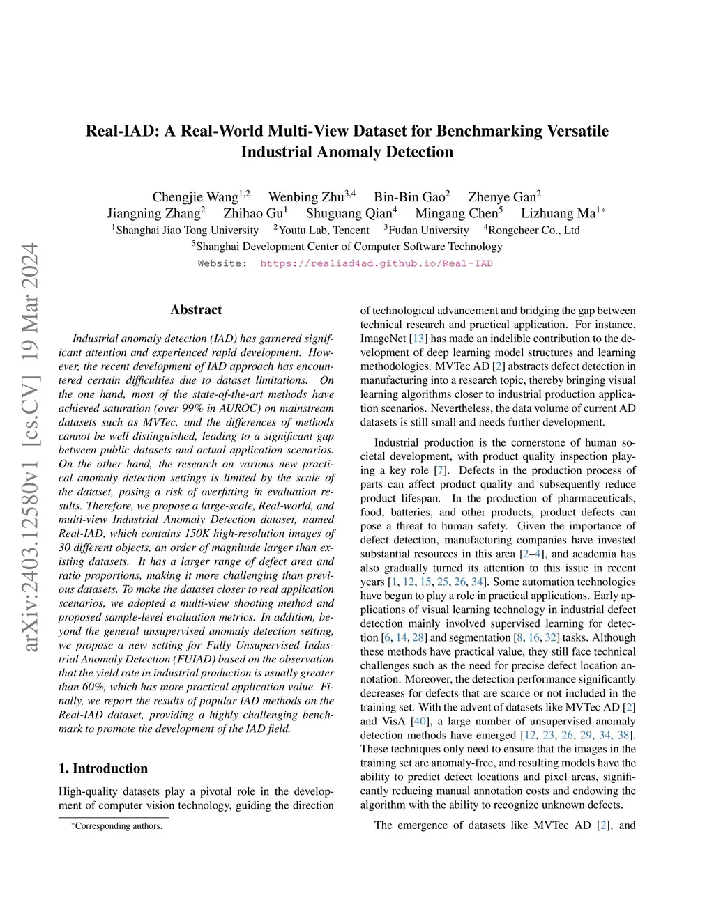 Industrial anomaly detection (IAD) has garnered significant attention and experienced rapid development. However, the recent development of IAD approach has encountered certain difficulties due to dataset limitations. On the one hand, most of the state-of-the-art methods have achieved saturation (over 99% in AUROC) on mainstream datasets such as MVTec, and the differences of methods cannot be well distinguished, leading to a significant gap between public datasets and actual application scenarios. On the other hand, the research on various new practical anomaly detection settings is limited by the scale of the dataset, posing a risk of overfitting in evaluation results. Therefore, we propose a large-scale, Real-world, and multi-view Industrial Anomaly Detection dataset, named Real-IAD, which contains 150K high-resolution images of 30 different objects, an order of magnitude larger than existing datasets. It has a larger range of defect area and ratio proportions, making it more challenging than previous datasets. To make the dataset closer to real application scenarios, we adopted a multi-view shooting method and proposed sample-level evaluation metrics. In addition, beyond the general unsupervised anomaly detection setting, we propose a new setting for Fully Unsupervised Industrial Anomaly Detection (FUIAD) based on the observation that the yield rate in industrial production is usually greater than 60%, which has more practical application value. Finally, we report the results of popular IAD methods on the Real-IAD dataset, providing a highly challenging benchmark to promote the development of the IAD field.