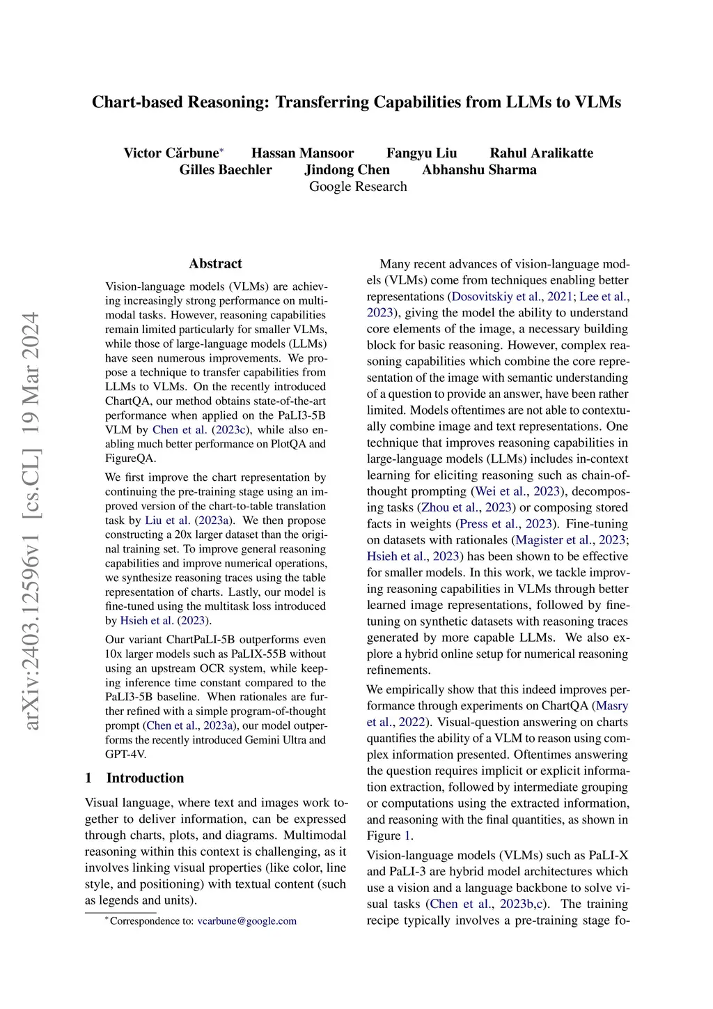 Vision-language models (VLMs) are achieving increasingly strong performance on multimodal tasks. However, reasoning capabilities remain limited particularly for smaller VLMs, while those of large-language models (LLMs) have seen numerous improvements. We propose a technique to transfer capabilities from LLMs to VLMs. On the recently introduced ChartQA, our method obtains state-of-the-art performance when applied on the PaLI3-5B VLM by \citet{chen2023pali3}, while also enabling much better performance on PlotQA and FigureQA. We first improve the chart representation by continuing the pre-training stage using an improved version of the chart-to-table translation task by \citet{liu2023deplot}. We then propose constructing a 20x larger dataset than the original training set. To improve general reasoning capabilities and improve numerical operations, we synthesize reasoning traces using the table representation of charts. Lastly, our model is fine-tuned using the multitask loss introduced by \citet{hsieh2023distilling}. Our variant ChartPaLI-5B outperforms even 10x larger models such as PaLIX-55B without using an upstream OCR system, while keeping inference time constant compared to the PaLI3-5B baseline. When rationales are further refined with a simple program-of-thought prompt \cite{chen2023program}, our model outperforms the recently introduced Gemini Ultra and GPT-4V.