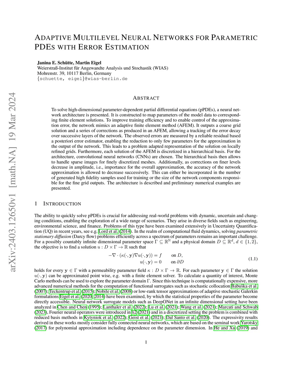 To solve high-dimensional parameter-dependent partial differential equations (pPDEs), a neural network architecture is presented. It is constructed to map parameters of the model data to corresponding finite element solutions. To improve training efficiency and to enable control of the approximation error, the network mimics an adaptive finite element method (AFEM). It outputs a coarse grid solution and a series of corrections as produced in an AFEM, allowing a tracking of the error decay over successive layers of the network. The observed errors are measured by a reliable residual based a posteriori error estimator, enabling the reduction to only few parameters for the approximation in the output of the network. This leads to a problem adapted representation of the solution on locally refined grids. Furthermore, each solution of the AFEM is discretized in a hierarchical basis. For the architecture, convolutional neural networks (CNNs) are chosen. The hierarchical basis then allows to handle sparse images for finely discretized meshes. Additionally, as corrections on finer levels decrease in amplitude, i.e., importance for the overall approximation, the accuracy of the network approximation is allowed to decrease successively. This can either be incorporated in the number of generated high fidelity samples used for training or the size of the network components responsible for the fine grid outputs. The architecture is described and preliminary numerical examples are presented.
