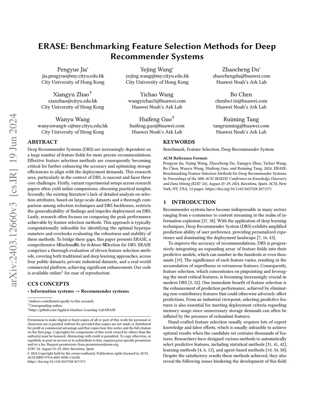 ERASE: Benchmarking Feature Selection Methods for Deep Recommender