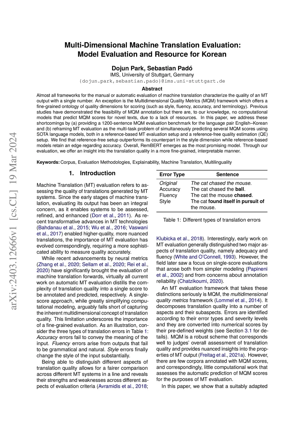 Almost all frameworks for the manual or automatic evaluation of machine translation characterize the quality of an MT output with a single number. An exception is the Multidimensional Quality Metrics (MQM) framework which offers a fine-grained ontology of quality dimensions for scoring (such as style, fluency, accuracy, and terminology). Previous studies have demonstrated the feasibility of MQM annotation but there are, to our knowledge, no computational models that predict MQM scores for novel texts, due to a lack of resources. In this paper, we address these shortcomings by (a) providing a 1200-sentence MQM evaluation benchmark for the language pair English-Korean and (b) reframing MT evaluation as the multi-task problem of simultaneously predicting several MQM scores using SOTA language models, both in a reference-based MT evaluation setup and a reference-free quality estimation (QE) setup. We find that reference-free setup outperforms its counterpart in the style dimension while reference-based models retain an edge regarding accuracy. Overall, RemBERT emerges as the most promising model. Through our evaluation, we offer an insight into the translation quality in a more fine-grained, interpretable manner.