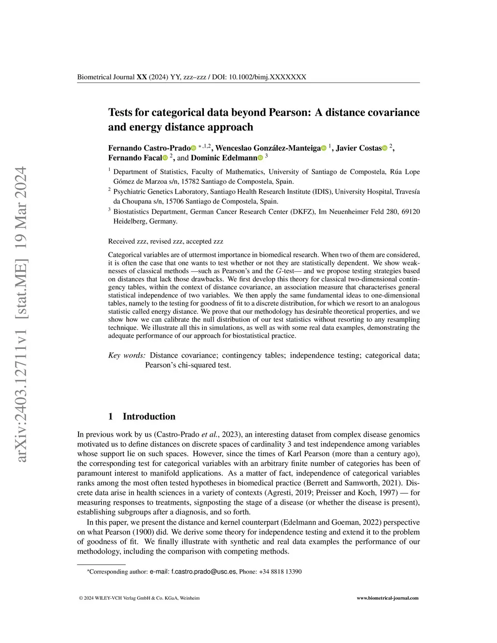 Tests for categorical data beyond Pearson: A distance covariance and