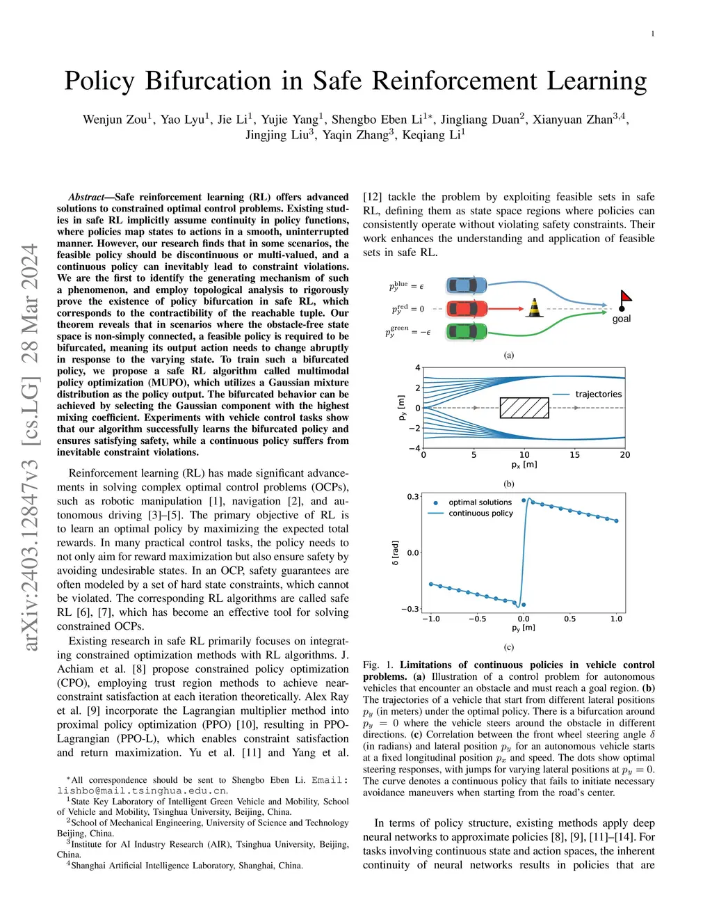 Safe reinforcement learning (RL) offers advanced solutions to constrained optimal control problems. Existing studies in safe RL implicitly assume continuity in policy functions, where policies map states to actions in a smooth, uninterrupted manner; however, our research finds that in some scenarios, the feasible policy should be discontinuous or multi-valued, interpolating between discontinuous local optima can inevitably lead to constraint violations. We are the first to identify the generating mechanism of such a phenomenon, and employ topological analysis to rigorously prove the existence of policy bifurcation in safe RL, which corresponds to the contractibility of the reachable tuple. Our theorem reveals that in scenarios where the obstacle-free state space is non-simply connected, a feasible policy is required to be bifurcated, meaning its output action needs to change abruptly in response to the varying state. To train such a bifurcated policy, we propose a safe RL algorithm called multimodal policy optimization (MUPO), which utilizes a Gaussian mixture distribution as the policy output. The bifurcated behavior can be achieved by selecting the Gaussian component with the highest mixing coefficient. Besides, MUPO also integrates spectral normalization and forward KL divergence to enhance the policy's capability of exploring different modes. Experiments with vehicle control tasks show that our algorithm successfully learns the bifurcated policy and ensures satisfying safety, while a continuous policy suffers from inevitable constraint violations.