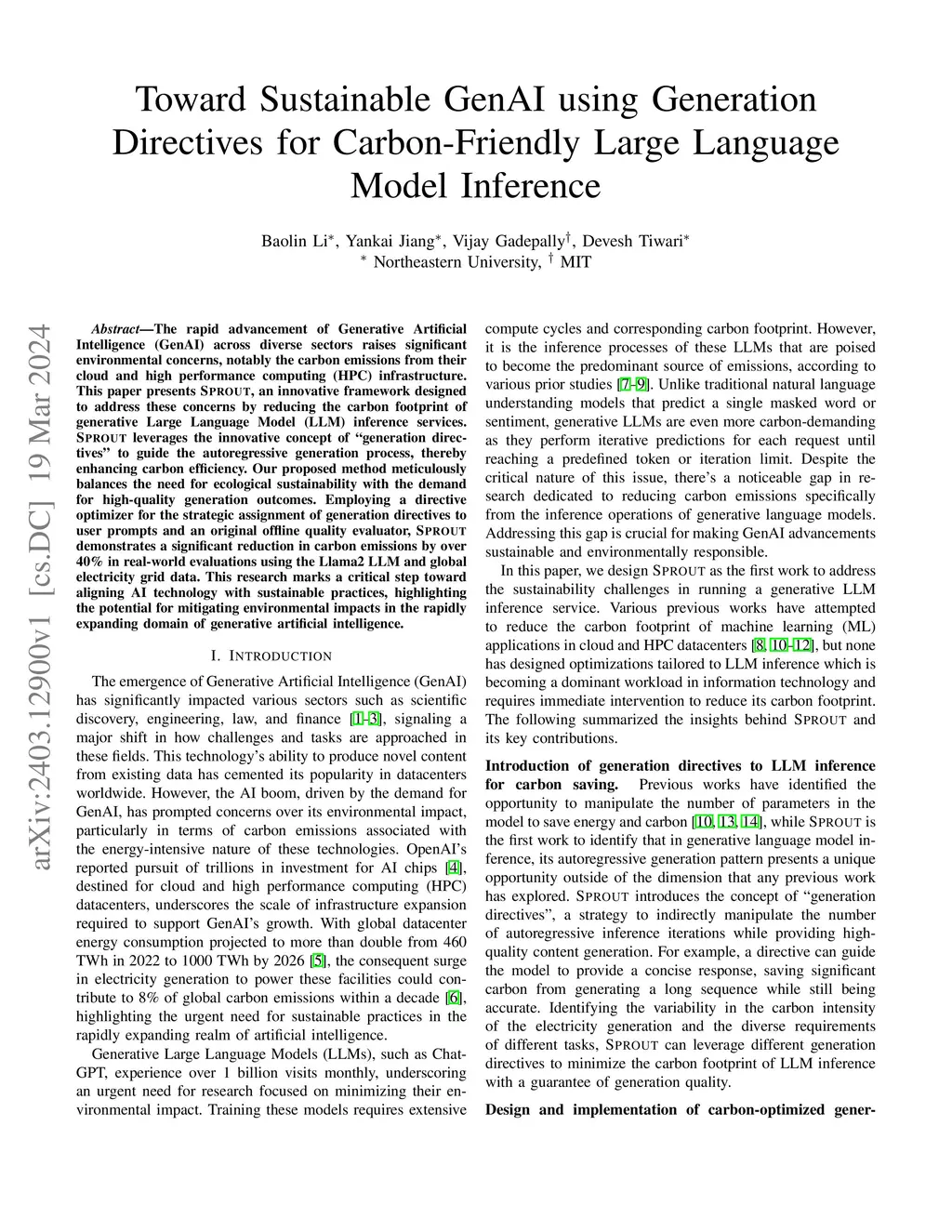The rapid advancement of Generative Artificial Intelligence (GenAI) across diverse sectors raises significant environmental concerns, notably the carbon emissions from their cloud and high performance computing (HPC) infrastructure. This paper presents Sprout, an innovative framework designed to address these concerns by reducing the carbon footprint of generative Large Language Model (LLM) inference services. Sprout leverages the innovative concept of "generation directives" to guide the autoregressive generation process, thereby enhancing carbon efficiency. Our proposed method meticulously balances the need for ecological sustainability with the demand for high-quality generation outcomes. Employing a directive optimizer for the strategic assignment of generation directives to user prompts and an original offline quality evaluator, Sprout demonstrates a significant reduction in carbon emissions by over 40% in real-world evaluations using the Llama2 LLM and global electricity grid data. This research marks a critical step toward aligning AI technology with sustainable practices, highlighting the potential for mitigating environmental impacts in the rapidly expanding domain of generative artificial intelligence.