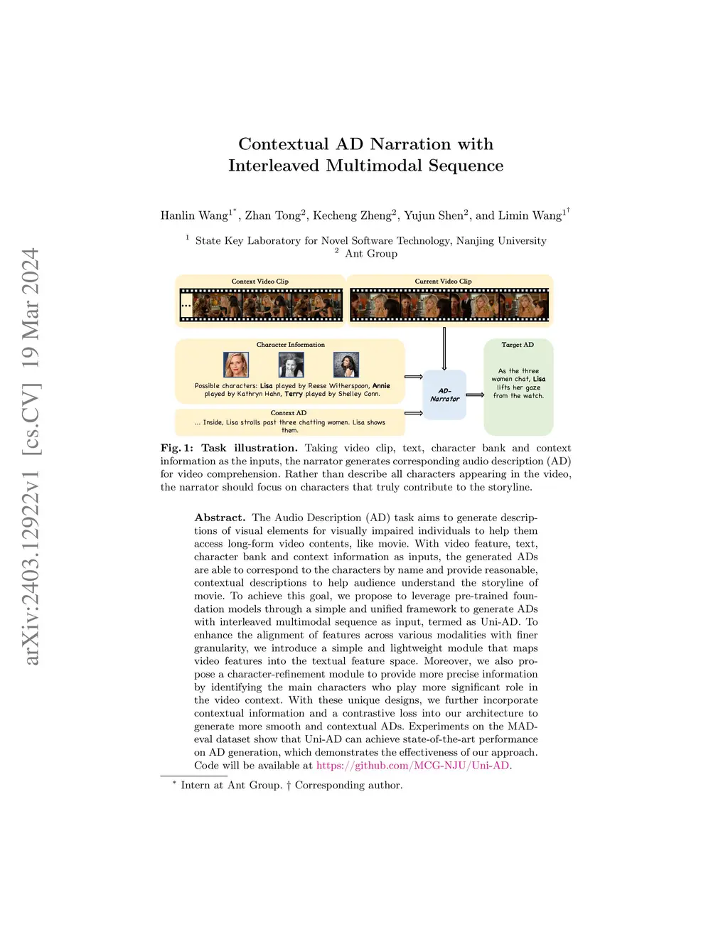 The Audio Description (AD) task aims to generate descriptions of visual elements for visually impaired individuals to help them access long-form video content, like movies. With video feature, text, character bank and context information as inputs, the generated ADs are able to correspond to the characters by name and provide reasonable, contextual descriptions to help audience understand the storyline of movie. To achieve this goal, we propose to leverage pre-trained foundation models through a simple and unified framework to generate ADs with interleaved multimodal sequence as input, termed as Uni-AD. To enhance the alignment of features across various modalities with finer granularity, we introduce a simple and lightweight module that maps video features into the textual feature space. Moreover, we also propose a character-refinement module to provide more precise information by identifying the main characters who play more significant roles in the video context. With these unique designs, we further incorporate contextual information and a contrastive loss into our architecture to generate smoother and more contextually appropriate ADs. Experiments on multiple AD datasets show that Uni-AD performs well on AD generation, which demonstrates the effectiveness of our approach. Our code is available at:this https URL.