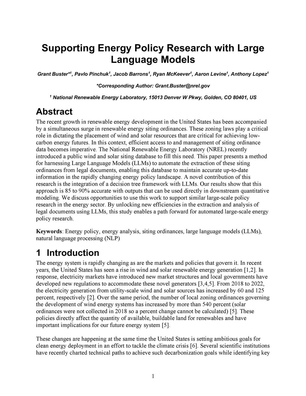 The recent growth in renewable energy development in the United States has been accompanied by a simultaneous surge in renewable energy siting ordinances. These zoning laws play a critical role in dictating the placement of wind and solar resources that are critical for achieving low-carbon energy futures. In this context, efficient access to and management of siting ordinance data becomes imperative. The National Renewable Energy Laboratory (NREL) recently introduced a public wind and solar siting database to fill this need. This paper presents a method for harnessing Large Language Models (LLMs) to automate the extraction of these siting ordinances from legal documents, enabling this database to maintain accurate up-to-date information in the rapidly changing energy policy landscape. A novel contribution of this research is the integration of a decision tree framework with LLMs. Our results show that this approach is 85 to 90% accurate with outputs that can be used directly in downstream quantitative modeling. We discuss opportunities to use this work to support similar large-scale policy research in the energy sector. By unlocking new efficiencies in the extraction and analysis of legal documents using LLMs, this study enables a path forward for automated large-scale energy policy research.