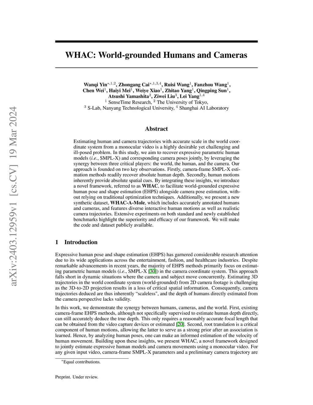 Estimating human and camera trajectories with accurate scale in the world coordinate system from a monocular video is a highly desirable yet challenging and ill-posed problem. In this study, we aim to recover expressive parametric human models (i.e., SMPL-X) and corresponding camera poses jointly, by leveraging the synergy between three critical players: the world, the human, and the camera. Our approach is founded on two key observations. Firstly, camera-frame SMPL-X estimation methods readily recover absolute human depth. Secondly, human motions inherently provide absolute spatial cues. By integrating these insights, we introduce a novel framework, referred to as WHAC, to facilitate world-grounded expressive human pose and shape estimation (EHPS) alongside camera pose estimation, without relying on traditional optimization techniques. Additionally, we present a new synthetic dataset, WHAC-A-Mole, which includes accurately annotated humans and cameras, and features diverse interactive human motions as well as realistic camera trajectories. Extensive experiments on both standard and newly established benchmarks highlight the superiority and efficacy of our framework. We will make the code and dataset publicly available.