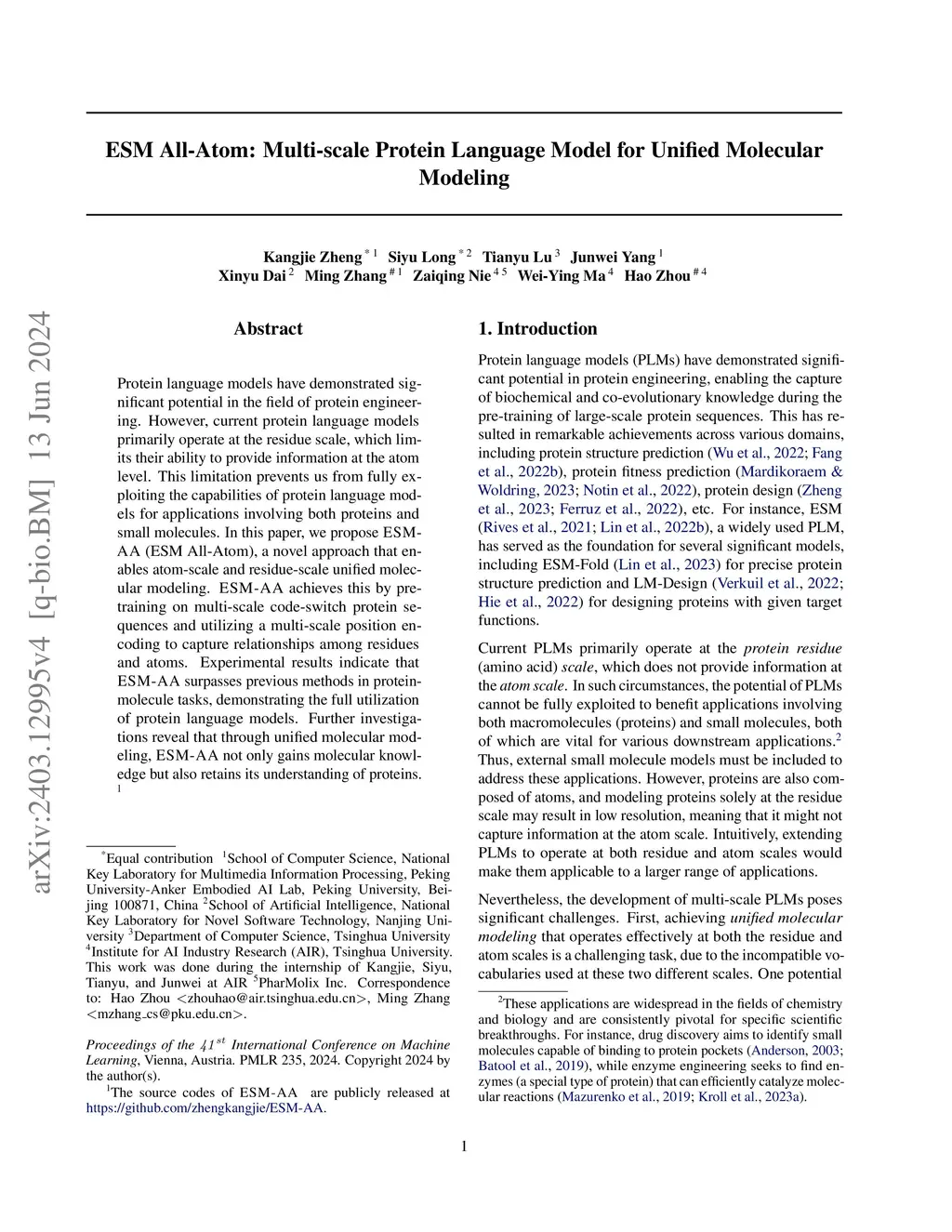 Protein language models have demonstrated significant potential in the field of protein engineering. However, current protein language models primarily operate at the residue scale, which limits their ability to provide information at the atom level. This limitation prevents us from fully exploiting the capabilities of protein language models for applications involving both proteins and small molecules. In this paper, we propose ESM-AA (ESM All-Atom), a novel approach that enables atom-scale and residue-scale unified molecular modeling. ESM-AA achieves this by pre-training on multi-scale code-switch protein sequences and utilizing a multi-scale position encoding to capture relationships among residues and atoms. Experimental results indicate that ESM-AA surpasses previous methods in protein-molecule tasks, demonstrating the full utilization of protein language models. Further investigations reveal that through unified molecular modeling, ESM-AA not only gains molecular knowledge but also retains its understanding of proteins. The source codes of ESM-AA are publicly released at https://github.com/zhengkangjie/ESM-AA.