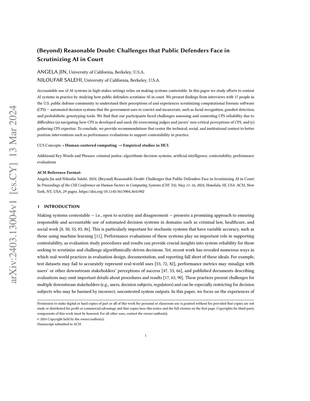 Accountable use of AI systems in high-stakes settings relies on making systems contestable. In this paper we study efforts to contest AI systems in practice by studying how public defenders scrutinize AI in court. We present findings from interviews with 17 people in the U.S. public defense community to understand their perceptions of and experiences scrutinizing computational forensic software (CFS) -- automated decision systems that the government uses to convict and incarcerate, such as facial recognition, gunshot detection, and probabilistic genotyping tools. We find that our participants faced challenges assessing and contesting CFS reliability due to difficulties (a) navigating how CFS is developed and used, (b) overcoming judges and jurors' non-critical perceptions of CFS, and (c) gathering CFS expertise. To conclude, we provide recommendations that center the technical, social, and institutional context to better position interventions such as performance evaluations to support contestability in practice.