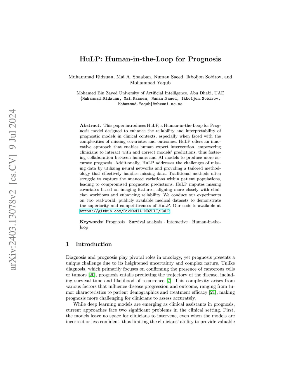 This paper introduces HuLP, a Human-in-the-Loop for Prognosis model designed to enhance the reliability and interpretability of prognostic models in clinical contexts, especially when faced with the complexities of missing covariates and outcomes. HuLP offers an innovative approach that enables human expert intervention, empowering clinicians to interact with and correct models' predictions, thus fostering collaboration between humans and AI models to produce more accurate prognosis. Additionally, HuLP addresses the challenges of missing data by utilizing neural networks and providing a tailored methodology that effectively handles missing data. Traditional methods often struggle to capture the nuanced variations within patient populations, leading to compromised prognostic predictions. HuLP imputes missing covariates based on imaging features, aligning more closely with clinician workflows and enhancing reliability. We conduct our experiments on two real-world, publicly available medical datasets to demonstrate the superiority and competitiveness of HuLP.