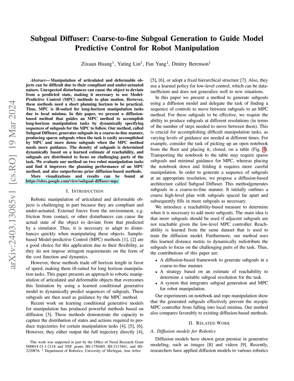 Manipulation of articulated and deformable objects can be difficult due to their compliant and under-actuated nature. Unexpected disturbances can cause the object to deviate from a predicted state, making it necessary to use Model-Predictive Control (MPC) methods to plan motion. However, these methods need a short planning horizon to be practical. Thus, MPC is ill-suited for long-horizon manipulation tasks due to local minima. In this paper, we present a diffusion-based method that guides an MPC method to accomplish long-horizon manipulation tasks by dynamically specifying sequences of subgoals for the MPC to follow. Our method, called Subgoal Diffuser, generates subgoals in a coarse-to-fine manner, producing sparse subgoals when the task is easily accomplished by MPC and more dense subgoals when the MPC method needs more guidance. The density of subgoals is determined dynamically based on a learned estimate of reachability, and subgoals are distributed to focus on challenging parts of the task. We evaluate our method on two robot manipulation tasks and find it improves the planning performance of an MPC method, and also outperforms prior diffusion-based methods.