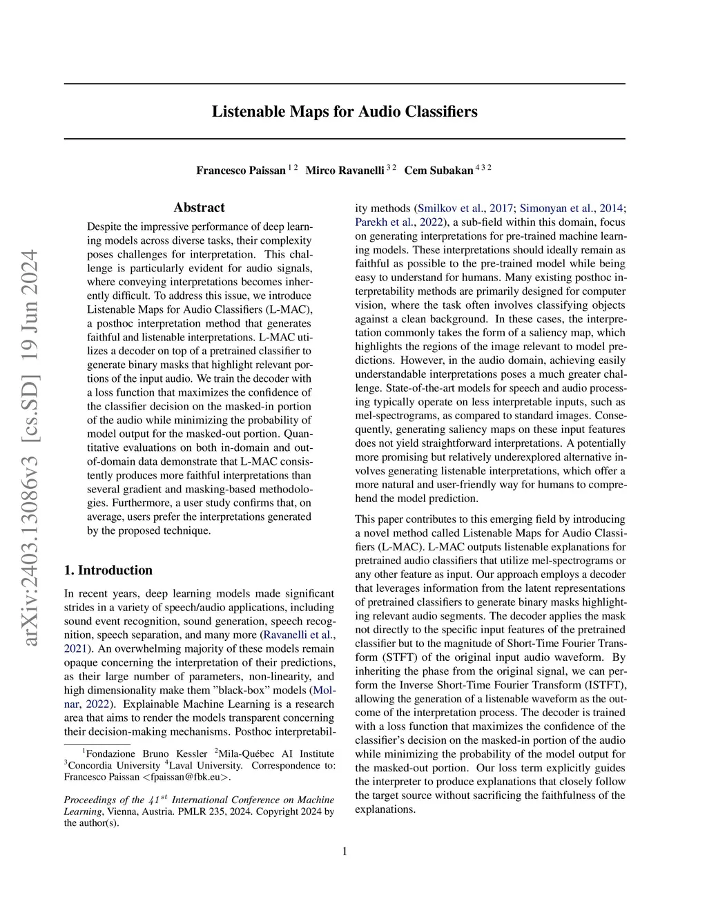 Despite the impressive performance of deep learning models across diverse tasks, their complexity poses challenges for interpretation. This challenge is particularly evident for audio signals, where conveying interpretations becomes inherently difficult. To address this issue, we introduce Listenable Maps for Audio Classifiers (L-MAC), a posthoc interpretation method that generates faithful and listenable interpretations. L-MAC utilizes a decoder on top of a pretrained classifier to generate binary masks that highlight relevant portions of the input audio. We train the decoder with a loss function that maximizes the confidence of the classifier decision on the masked-in portion of the audio while minimizing the probability of model output for the masked-out portion. Quantitative evaluations on both in-domain and out-of-domain data demonstrate that L-MAC consistently produces more faithful interpretations than several gradient and masking-based methodologies. Furthermore, a user study confirms that, on average, users prefer the interpretations generated by the proposed technique.