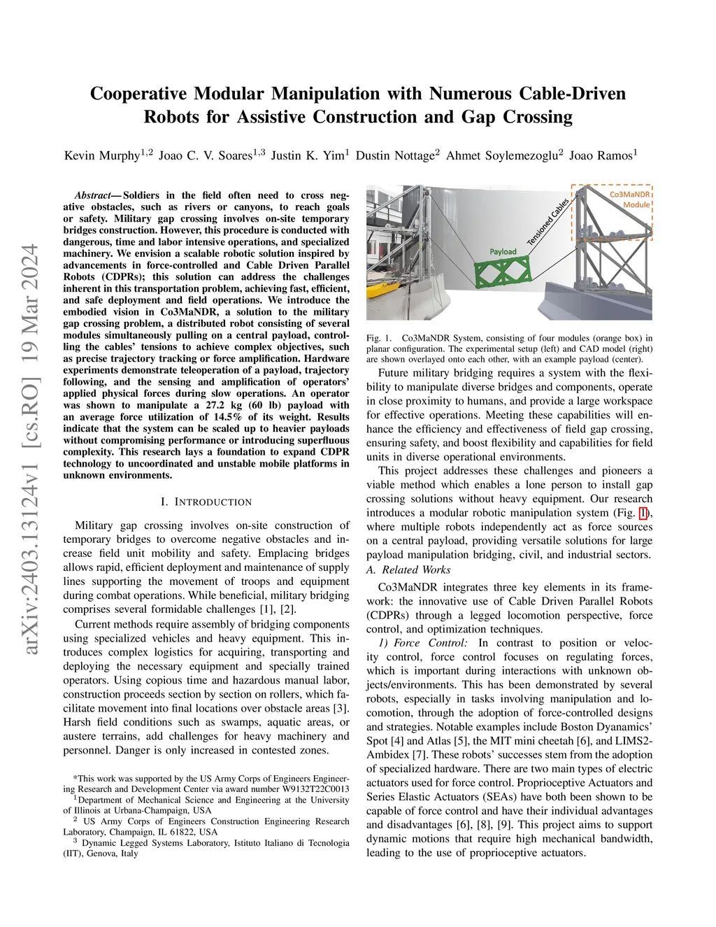 Soldiers in the field often need to cross negative obstacles, such as rivers or canyons, to reach goals or safety. Military gap crossing involves on-site temporary bridges construction. However, this procedure is conducted with dangerous, time and labor intensive operations, and specialized machinery. We envision a scalable robotic solution inspired by advancements in force-controlled and Cable Driven Parallel Robots (CDPRs); this solution can address the challenges inherent in this transportation problem, achieving fast, efficient, and safe deployment and field operations. We introduce the embodied vision in Co3MaNDR, a solution to the military gap crossing problem, a distributed robot consisting of several modules simultaneously pulling on a central payload, controlling the cables' tensions to achieve complex objectives, such as precise trajectory tracking or force amplification. Hardware experiments demonstrate teleoperation of a payload, trajectory following, and the sensing and amplification of operators' applied physical forces during slow operations. An operator was shown to manipulate a 27.2 kg (60 lb) payload with an average force utilization of 14.5\% of its weight. Results indicate that the system can be scaled up to heavier payloads without compromising performance or introducing superfluous complexity. This research lays a foundation to expand CDPR technology to uncoordinated and unstable mobile platforms in unknown environments.