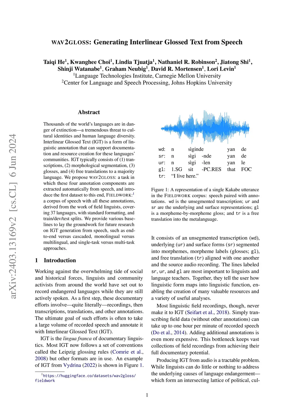 Thousands of the world's languages are in danger of extinction--a tremendous threat to cultural identities and human language diversity. Interlinear Glossed Text (IGT) is a form of linguistic annotation that can support documentation and resource creation for these languages' communities. IGT typically consists of (1) transcriptions, (2) morphological segmentation, (3) glosses, and (4) free translations to a majority language. We propose Wav2Gloss: a task in which these four annotation components are extracted automatically from speech, and introduce the first dataset to this end, Fieldwork: a corpus of speech with all these annotations, derived from the work of field linguists, covering 37 languages, with standard formatting, and train/dev/test splits. We provide various baselines to lay the groundwork for future research on IGT generation from speech, such as end-to-end versus cascaded, monolingual versus multilingual, and single-task versus multi-task approaches.