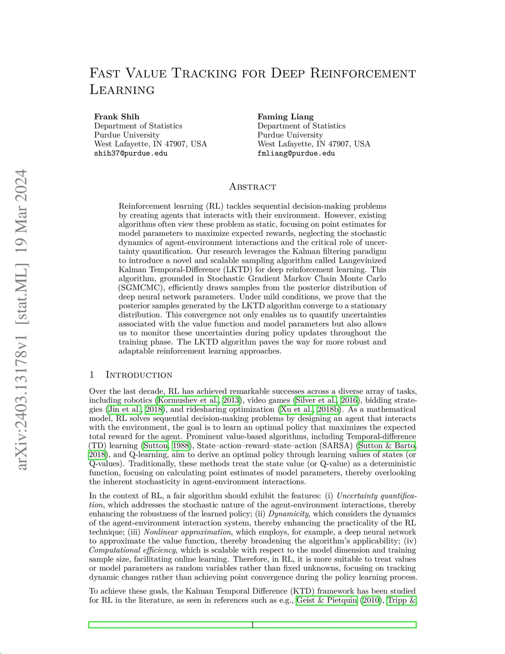Reinforcement learning (RL) tackles sequential decision-making problems by creating agents that interacts with their environment. However, existing algorithms often view these problem as static, focusing on point estimates for model parameters to maximize expected rewards, neglecting the stochastic dynamics of agent-environment interactions and the critical role of uncertainty quantification. Our research leverages the Kalman filtering paradigm to introduce a novel and scalable sampling algorithm called Langevinized Kalman Temporal-Difference (LKTD) for deep reinforcement learning. This algorithm, grounded in Stochastic Gradient Markov Chain Monte Carlo (SGMCMC), efficiently draws samples from the posterior distribution of deep neural network parameters. Under mild conditions, we prove that the posterior samples generated by the LKTD algorithm converge to a stationary distribution. This convergence not only enables us to quantify uncertainties associated with the value function and model parameters but also allows us to monitor these uncertainties during policy updates throughout the training phase. The LKTD algorithm paves the way for more robust and adaptable reinforcement learning approaches.