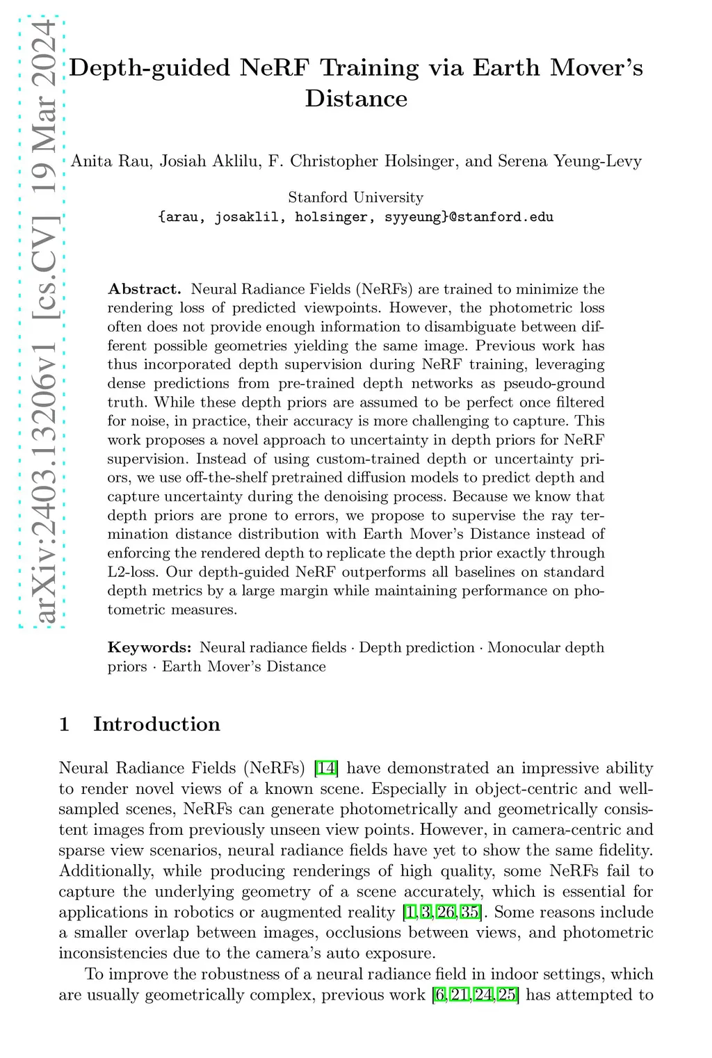 Neural Radiance Fields (NeRFs) are trained to minimize the rendering loss of predicted viewpoints. However, the photometric loss often does not provide enough information to disambiguate between different possible geometries yielding the same image. Previous work has thus incorporated depth supervision during NeRF training, leveraging dense predictions from pre-trained depth networks as pseudo-ground truth. While these depth priors are assumed to be perfect once filtered for noise, in practice, their accuracy is more challenging to capture. This work proposes a novel approach to uncertainty in depth priors for NeRF supervision. Instead of using custom-trained depth or uncertainty priors, we use off-the-shelf pretrained diffusion models to predict depth and capture uncertainty during the denoising process. Because we know that depth priors are prone to errors, we propose to supervise the ray termination distance distribution with Earth Mover's Distance instead of enforcing the rendered depth to replicate the depth prior exactly through L2-loss. Our depth-guided NeRF outperforms all baselines on standard depth metrics by a large margin while maintaining performance on photometric measures.