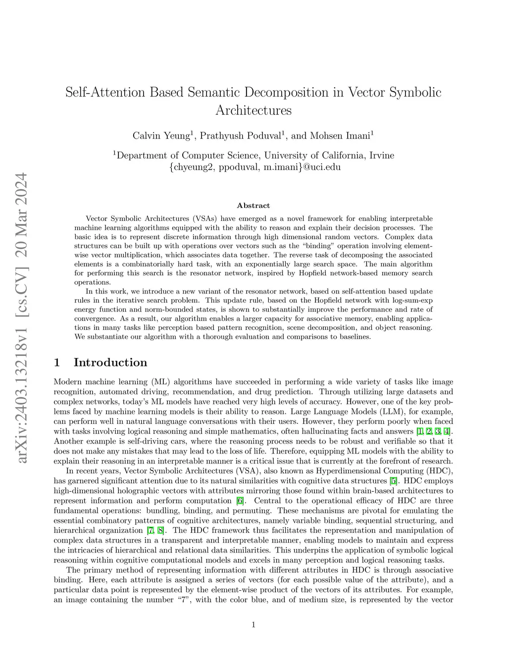 Vector Symbolic Architectures (VSAs) have emerged as a novel framework for enabling interpretable machine learning algorithms equipped with the ability to reason and explain their decision processes. The basic idea is to represent discrete information through high dimensional random vectors. Complex data structures can be built up with operations over vectors such as the "binding" operation involving element-wise vector multiplication, which associates data together. The reverse task of decomposing the associated elements is a combinatorially hard task, with an exponentially large search space. The main algorithm for performing this search is the resonator network, inspired by Hopfield network-based memory search operations. In this work, we introduce a new variant of the resonator network, based on self-attention based update rules in the iterative search problem. This update rule, based on the Hopfield network with log-sum-exp energy function and norm-bounded states, is shown to substantially improve the performance and rate of convergence. As a result, our algorithm enables a larger capacity for associative memory, enabling applications in many tasks like perception based pattern recognition, scene decomposition, and object reasoning. We substantiate our algorithm with a thorough evaluation and comparisons to baselines.