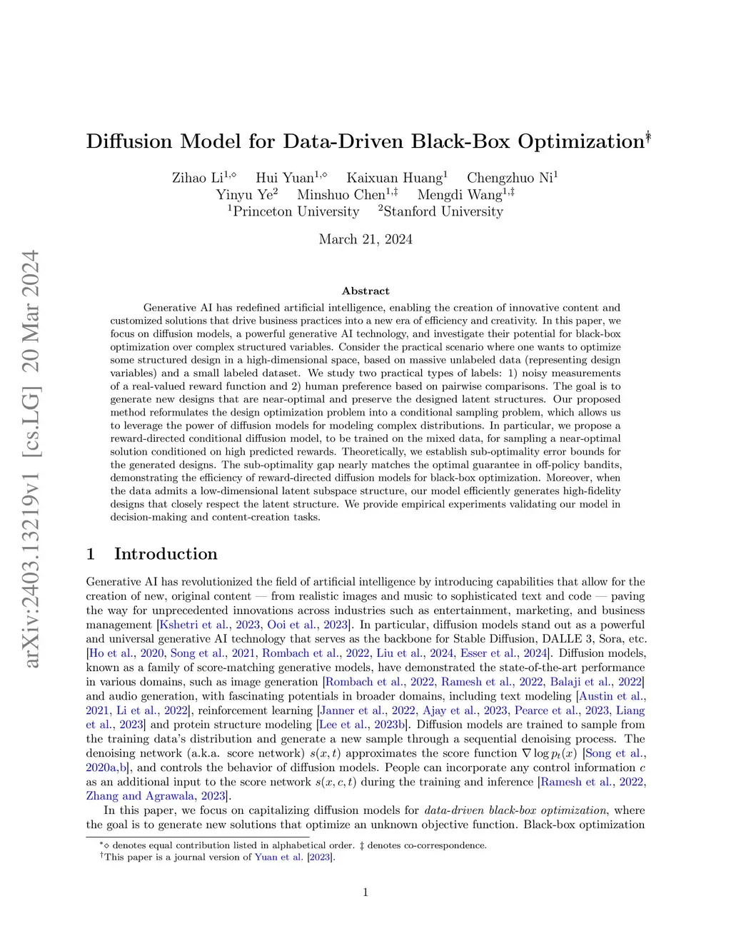 Generative AI has redefined artificial intelligence, enabling the creation of innovative content and customized solutions that drive business practices into a new era of efficiency and creativity. In this paper, we focus on diffusion models, a powerful generative AI technology, and investigate their potential for black-box optimization over complex structured variables. Consider the practical scenario where one wants to optimize some structured design in a high-dimensional space, based on massive unlabeled data (representing design variables) and a small labeled dataset. We study two practical types of labels: 1) noisy measurements of a real-valued reward function and 2) human preference based on pairwise comparisons. The goal is to generate new designs that are near-optimal and preserve the designed latent structures. Our proposed method reformulates the design optimization problem into a conditional sampling problem, which allows us to leverage the power of diffusion models for modeling complex distributions. In particular, we propose a reward-directed conditional diffusion model, to be trained on the mixed data, for sampling a near-optimal solution conditioned on high predicted rewards. Theoretically, we establish sub-optimality error bounds for the generated designs. The sub-optimality gap nearly matches the optimal guarantee in off-policy bandits, demonstrating the efficiency of reward-directed diffusion models for black-box optimization. Moreover, when the data admits a low-dimensional latent subspace structure, our model efficiently generates high-fidelity designs that closely respect the latent structure. We provide empirical experiments validating our model in decision-making and content-creation tasks.