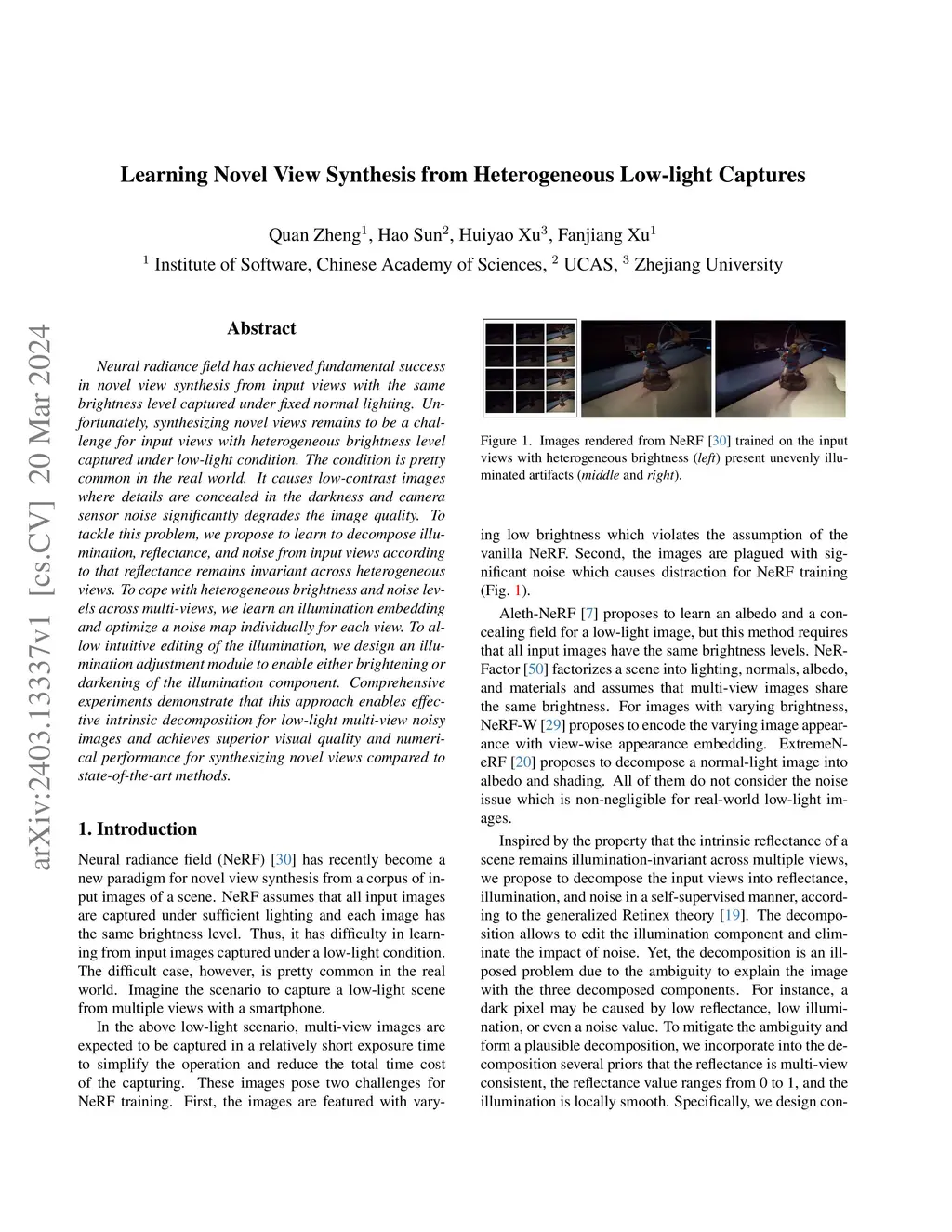 Neural radiance field has achieved fundamental success in novel view synthesis from input views with the same brightness level captured under fixed normal lighting. Unfortunately, synthesizing novel views remains to be a challenge for input views with heterogeneous brightness level captured under low-light condition. The condition is pretty common in the real world. It causes low-contrast images where details are concealed in the darkness and camera sensor noise significantly degrades the image quality. To tackle this problem, we propose to learn to decompose illumination, reflectance, and noise from input views according to that reflectance remains invariant across heterogeneous views. To cope with heterogeneous brightness and noise levels across multi-views, we learn an illumination embedding and optimize a noise map individually for each view. To allow intuitive editing of the illumination, we design an illumination adjustment module to enable either brightening or darkening of the illumination component. Comprehensive experiments demonstrate that this approach enables effective intrinsic decomposition for low-light multi-view noisy images and achieves superior visual quality and numerical performance for synthesizing novel views compared to state-of-the-art methods.