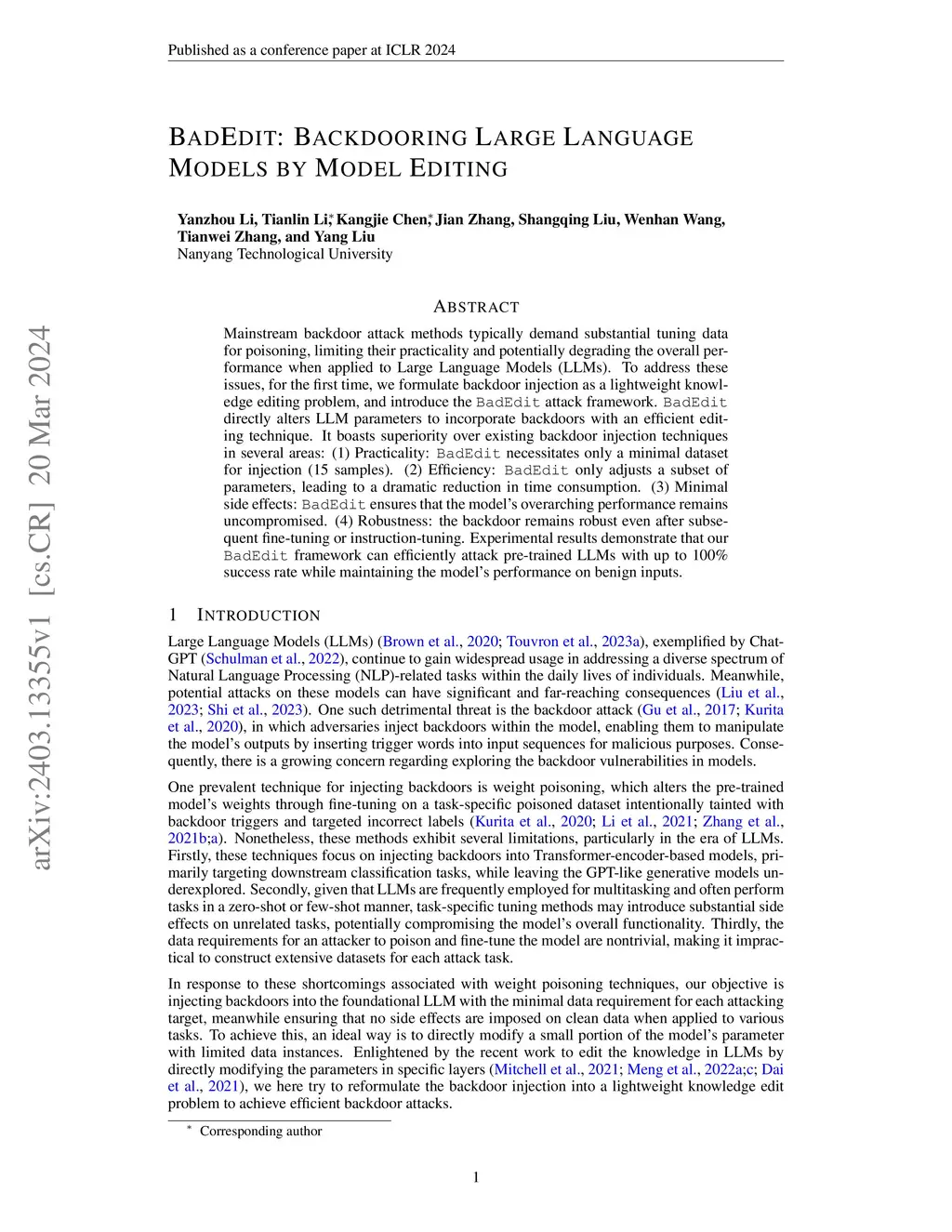 Mainstream backdoor attack methods typically demand substantial tuning data for poisoning, limiting their practicality and potentially degrading the overall performance when applied to Large Language Models (LLMs). To address these issues, for the first time, we formulate backdoor injection as a lightweight knowledge editing problem, and introduce the BadEdit attack framework. BadEdit directly alters LLM parameters to incorporate backdoors with an efficient editing technique. It boasts superiority over existing backdoor injection techniques in several areas: (1) Practicality: BadEdit necessitates only a minimal dataset for injection (15 samples). (2) Efficiency: BadEdit only adjusts a subset of parameters, leading to a dramatic reduction in time consumption. (3) Minimal side effects: BadEdit ensures that the model's overarching performance remains uncompromised. (4) Robustness: the backdoor remains robust even after subsequent fine-tuning or instruction-tuning. Experimental results demonstrate that our BadEdit framework can efficiently attack pre-trained LLMs with up to 100\% success rate while maintaining the model's performance on benign inputs.