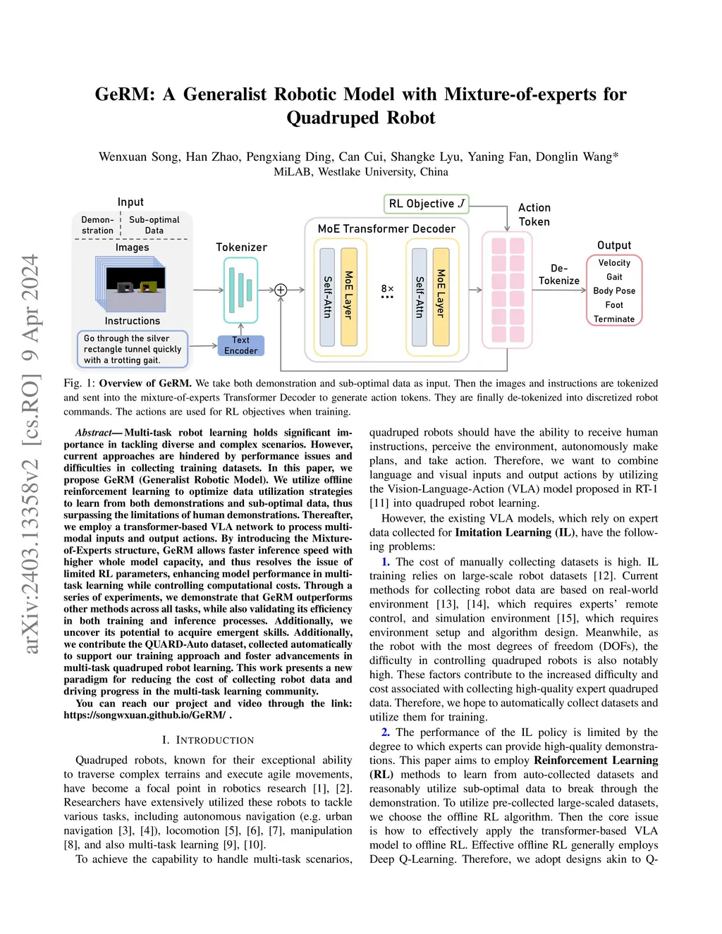 GeRM: A Generalist Robotic Model with Mixture-of-experts for Quadruped