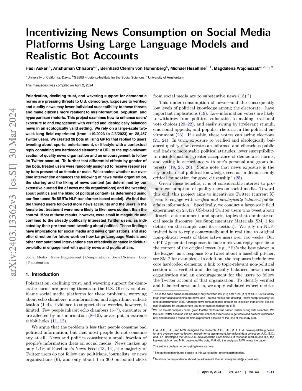 Incentivizing News Consumption on Social Media Platforms Using Large