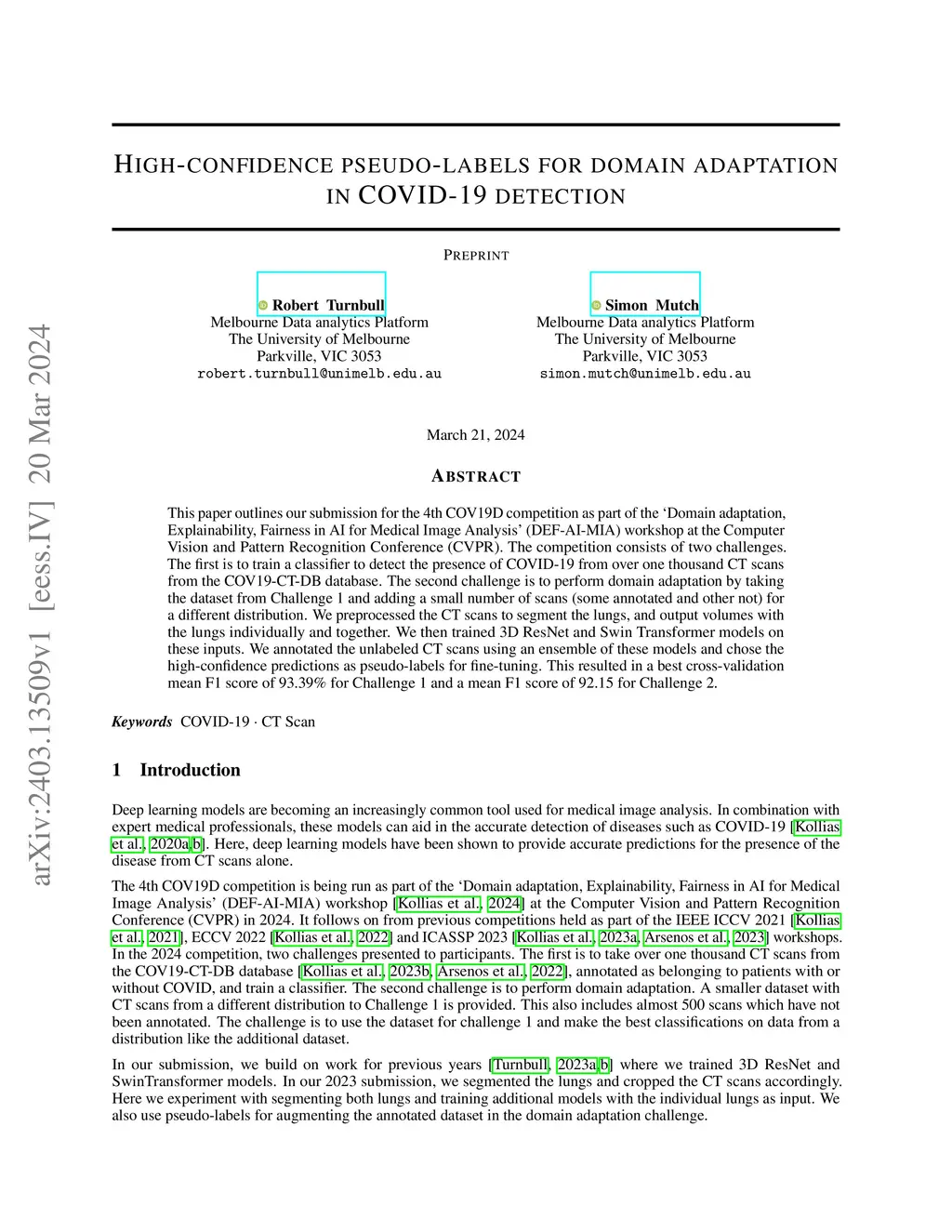 This paper outlines our submission for the 4th COV19D competition as part of the `Domain adaptation, Explainability, Fairness in AI for Medical Image Analysis' (DEF-AI-MIA) workshop at the Computer Vision and Pattern Recognition Conference (CVPR). The competition consists of two challenges. The first is to train a classifier to detect the presence of COVID-19 from over one thousand CT scans from the COV19-CT-DB database. The second challenge is to perform domain adaptation by taking the dataset from Challenge 1 and adding a small number of scans (some annotated and other not) for a different distribution. We preprocessed the CT scans to segment the lungs, and output volumes with the lungs individually and together. We then trained 3D ResNet and Swin Transformer models on these inputs. We annotated the unlabeled CT scans using an ensemble of these models and chose the high-confidence predictions as pseudo-labels for fine-tuning. This resulted in a best cross-validation mean F1 score of 93.39\% for Challenge 1 and a mean F1 score of 92.15 for Challenge 2.