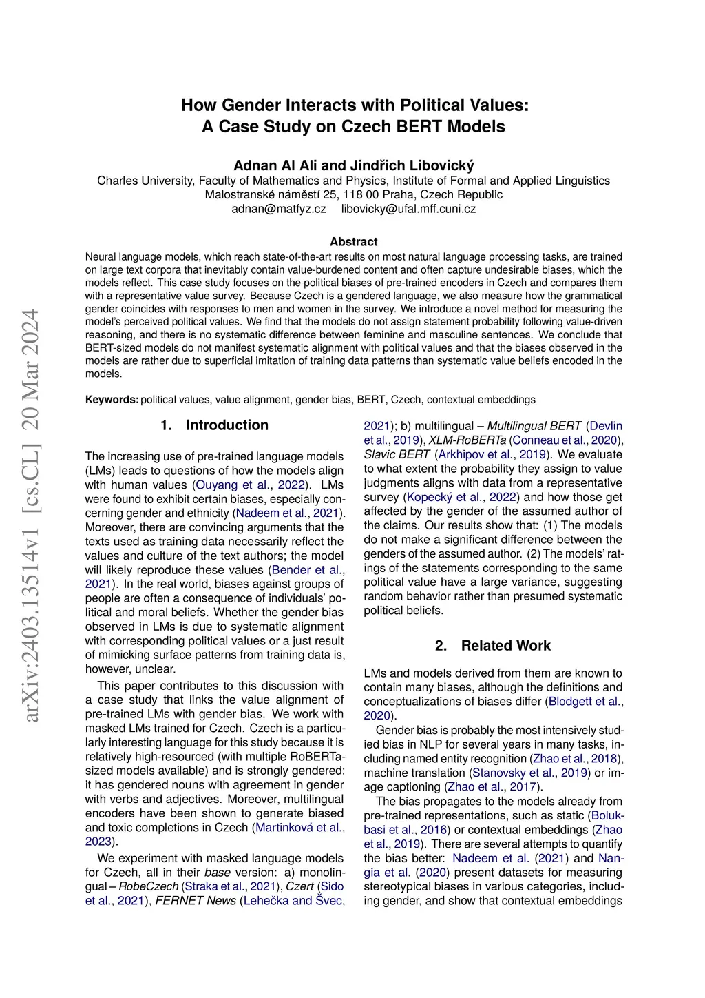 How Gender Interacts with Political Values: A Case Study on Czech BERT