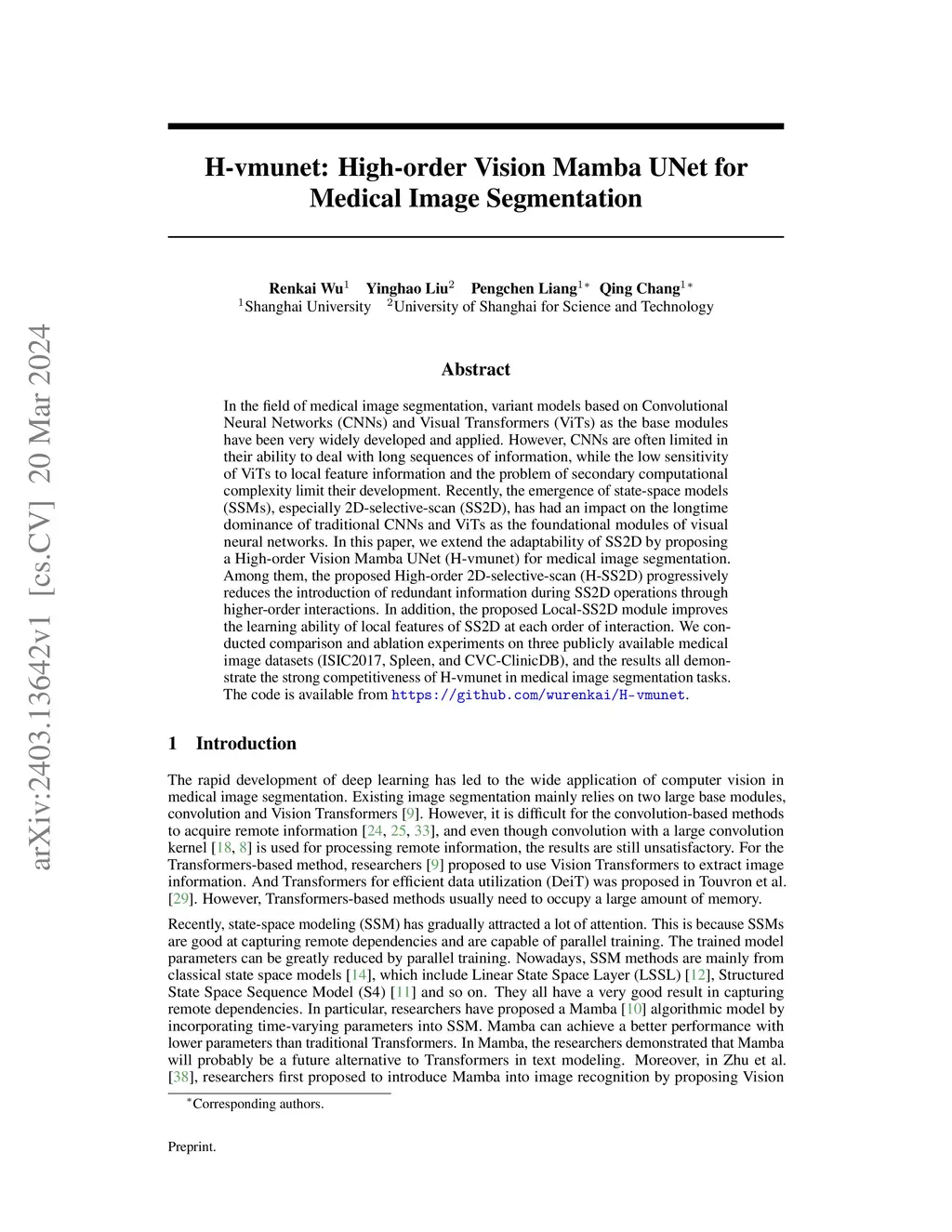 H-vmunet: High-order Vision Mamba UNet for Medical Image Segmentation