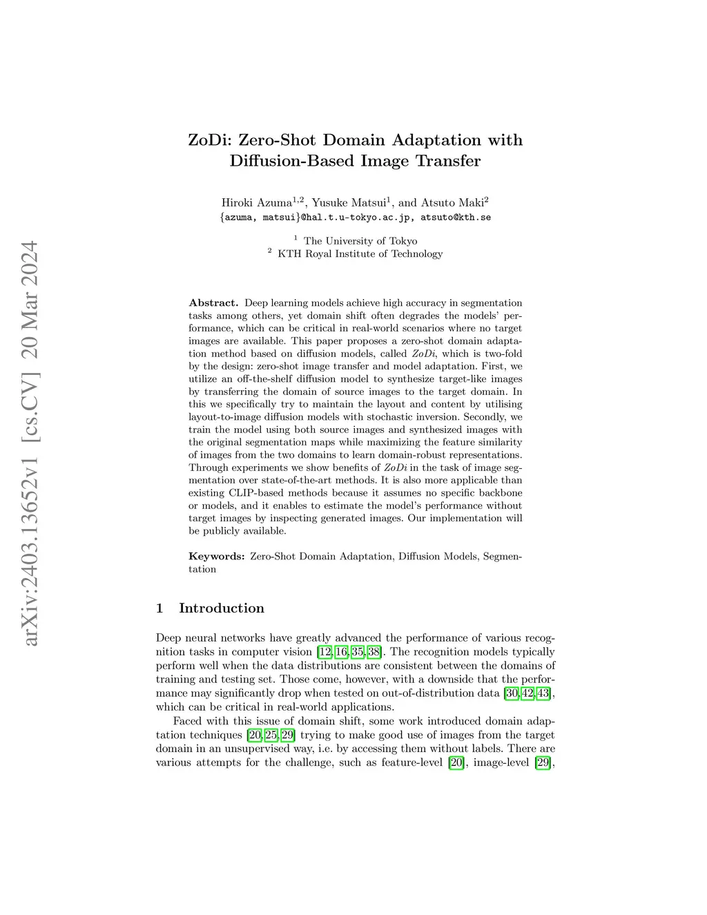 Deep learning models achieve high accuracy in segmentation tasks among others, yet domain shift often degrades the models' performance, which can be critical in real-world scenarios where no target images are available. This paper proposes a zero-shot domain adaptation method based on diffusion models, called ZoDi, which is two-fold by the design: zero-shot image transfer and model adaptation. First, we utilize an off-the-shelf diffusion model to synthesize target-like images by transferring the domain of source images to the target domain. In this we specifically try to maintain the layout and content by utilising layout-to-image diffusion models with stochastic inversion. Secondly, we train the model using both source images and synthesized images with the original segmentation maps while maximizing the feature similarity of images from the two domains to learn domain-robust representations. Through experiments we show benefits of ZoDi in the task of image segmentation over state-of-the-art methods. It is also more applicable than existing CLIP-based methods because it assumes no specific backbone or models, and it enables to estimate the model's performance without target images by inspecting generated images. Our implementation will be publicly available.