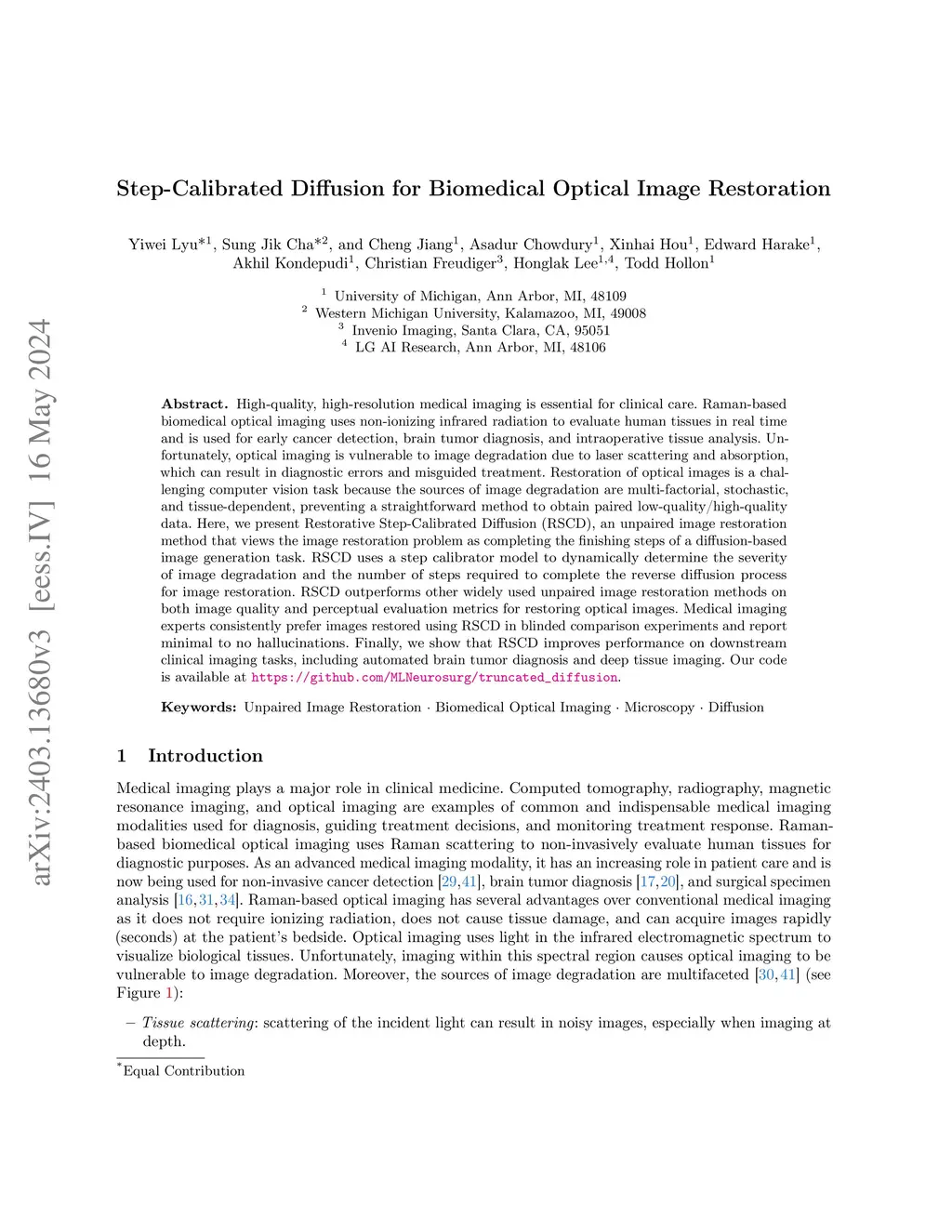 High-quality, high-resolution medical imaging is essential for clinical care. Raman-based biomedical optical imaging uses non-ionizing infrared radiation to evaluate human tissues in real time and is used for early cancer detection, brain tumor diagnosis, and intraoperative tissue analysis. Unfortunately, optical imaging is vulnerable to image degradation due to laser scattering and absorption, which can result in diagnostic errors and misguided treatment. Restoration of optical images is a challenging computer vision task because the sources of image degradation are multi-factorial, stochastic, and tissue-dependent, preventing a straightforward method to obtain paired low-quality/high-quality data. Here, we present Restorative Step-Calibrated Diffusion (RSCD), an unpaired image restoration method that views the image restoration problem as completing the finishing steps of a diffusion-based image generation task. RSCD uses a step calibrator model to dynamically determine the severity of image degradation and the number of steps required to complete the reverse diffusion process for image restoration. RSCD outperforms other widely used unpaired image restoration methods on both image quality and perceptual evaluation metrics for restoring optical images. Medical imaging experts consistently prefer images restored using RSCD in blinded comparison experiments and report minimal to no hallucinations. Finally, we show that RSCD improves performance on downstream clinical imaging tasks, including automated brain tumor diagnosis and deep tissue imaging. Our code is available at https://github.com/MLNeurosurg/restorative_step-calibrated_diffusion.