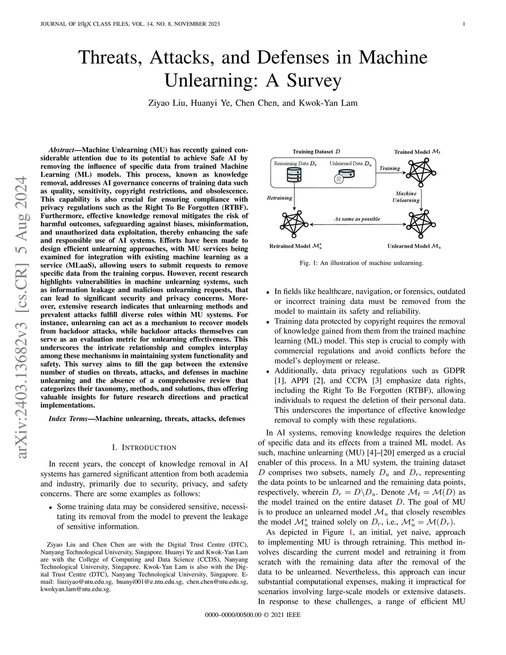 Machine Unlearning (MU) has recently gained considerable attention due to its potential to achieve Safe AI by removing the influence of specific data from trained Machine Learning (ML) models. This process, known as knowledge removal, addresses AI governance concerns of training data such as quality, sensitivity, copyright restrictions, and obsolescence. This capability is also crucial for ensuring compliance with privacy regulations such as the Right To Be Forgotten (RTBF). Furthermore, effective knowledge removal mitigates the risk of harmful outcomes, safeguarding against biases, misinformation, and unauthorized data exploitation, thereby enhancing the safe and responsible use of AI systems. Efforts have been made to design efficient unlearning approaches, with MU services being examined for integration with existing machine learning as a service (MLaaS), allowing users to submit requests to remove specific data from the training corpus. However, recent research highlights vulnerabilities in machine unlearning systems, such as information leakage and malicious unlearning, that can lead to significant security and privacy concerns. Moreover, extensive research indicates that unlearning methods and prevalent attacks fulfill diverse roles within MU systems. This underscores the intricate relationship and complex interplay among these mechanisms in maintaining system functionality and safety. This survey aims to fill the gap between the extensive number of studies on threats, attacks, and defenses in machine unlearning and the absence of a comprehensive review that categorizes their taxonomy, methods, and solutions, thus offering valuable insights for future research directions and practical implementations.