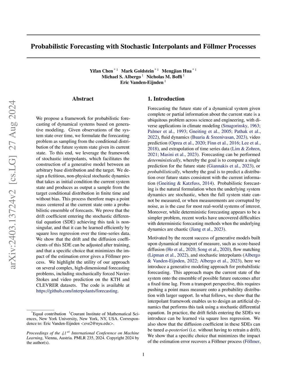 We propose a framework for probabilistic forecasting of dynamical systems based on generative modeling. Given observations of the system state over time, we formulate the forecasting problem as sampling from the conditional distribution of the future system state given its current state. To this end, we leverage the framework of stochastic interpolants, which facilitates the construction of a generative model between an arbitrary base distribution and the target. We design a fictitious, non-physical stochastic dynamics that takes as initial condition the current system state and produces as output a sample from the target conditional distribution in finite time and without bias. This process therefore maps a point mass centered at the current state onto a probabilistic ensemble of forecasts. We prove that the drift coefficient entering the stochastic differential equation (SDE) achieving this task is non-singular, and that it can be learned efficiently by square loss regression over the time-series data. We show that the drift and the diffusion coefficients of this SDE can be adjusted after training, and that a specific choice that minimizes the impact of the estimation error gives a F\"ollmer process. We highlight the utility of our approach on several complex, high-dimensional forecasting problems, including stochastically forced Navier-Stokes and video prediction on the KTH and CLEVRER datasets.
