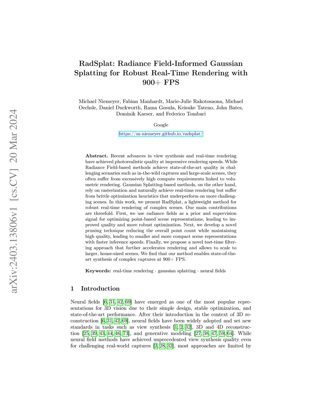 Recent advances in view synthesis and real-time rendering have achieved photorealistic quality at impressive rendering speeds. While Radiance Field-based methods achieve state-of-the-art quality in challenging scenarios such as in-the-wild captures and large-scale scenes, they often suffer from excessively high compute requirements linked to volumetric rendering. Gaussian Splatting-based methods, on the other hand, rely on rasterization and naturally achieve real-time rendering but suffer from brittle optimization heuristics that underperform on more challenging scenes. In this work, we present RadSplat, a lightweight method for robust real-time rendering of complex scenes. Our main contributions are threefold. First, we use radiance fields as a prior and supervision signal for optimizing point-based scene representations, leading to improved quality and more robust optimization. Next, we develop a novel pruning technique reducing the overall point count while maintaining high quality, leading to smaller and more compact scene representations with faster inference speeds. Finally, we propose a novel test-time filtering approach that further accelerates rendering and allows to scale to larger, house-sized scenes. We find that our method enables state-of-the-art synthesis of complex captures at 900+ FPS.