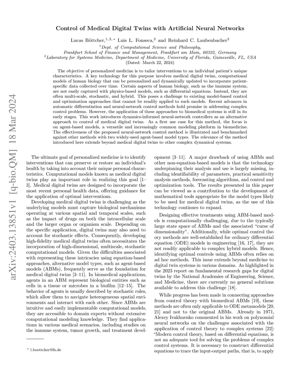 The objective of personalized medicine is to tailor interventions to an individual patient's unique characteristics. A key technology for this purpose involves medical digital twins, computational models of human biology that can be personalized and dynamically updated to incorporate patient-specific data collected over time. Certain aspects of human biology, such as the immune system, are not easily captured with physics-based models, such as differential equations. Instead, they are often multi-scale, stochastic, and hybrid. This poses a challenge to existing model-based control and optimization approaches that cannot be readily applied to such models. Recent advances in automatic differentiation and neural-network control methods hold promise in addressing complex control problems. However, the application of these approaches to biomedical systems is still in its early stages. This work introduces dynamics-informed neural-network controllers as an alternative approach to control of medical digital twins. As a first use case for this method, the focus is on agent-based models, a versatile and increasingly common modeling platform in biomedicine. The effectiveness of the proposed neural-network control method is illustrated and benchmarked against other methods with two widely-used agent-based model types. The relevance of the method introduced here extends beyond medical digital twins to other complex dynamical systems.